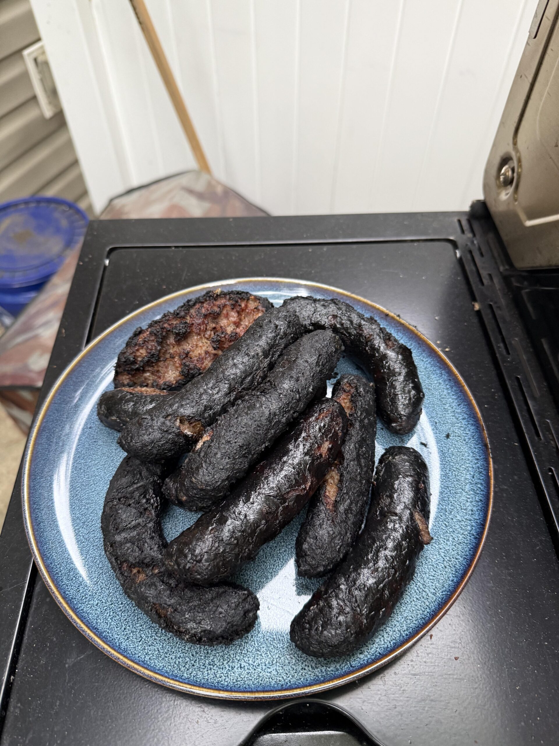 Clearly walked away to grab a brew and a flare up happened…. Lesson learned, hopefully. Watch those babies like a hawk. Things can go sideways quickly with brats, especially once the drippings start hitting the heat source