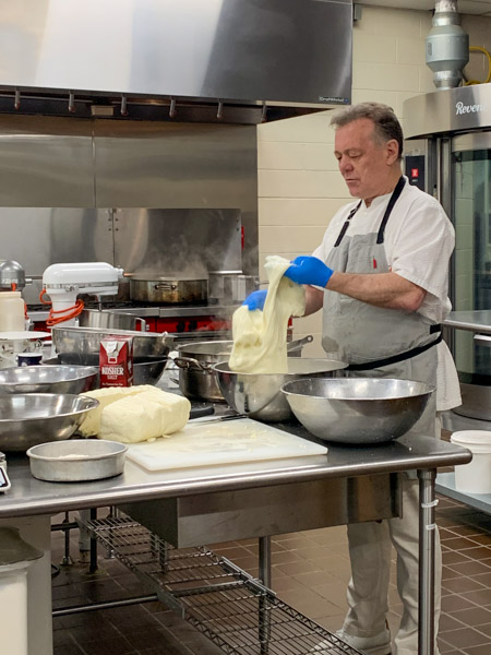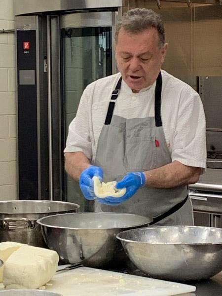 At left, students try their hands at stretching paper-thin crusts and adding toppings. Chef Roberto Caporuscio, on right, demonstrates how to stretch and shape handmade mozzarella.