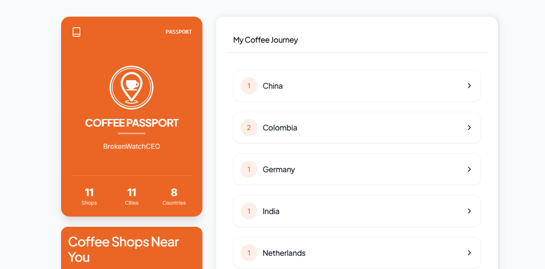 I am building a specialty coffee shop directory to help people from all over the world discover new place to enjoy a good espresso, and on top of that I designed a feature that allows you to mark your visit as a way to keep track of the coffee shops you've visited, kind of like playing pokemon with coffee shops, and called it a coffee passport.