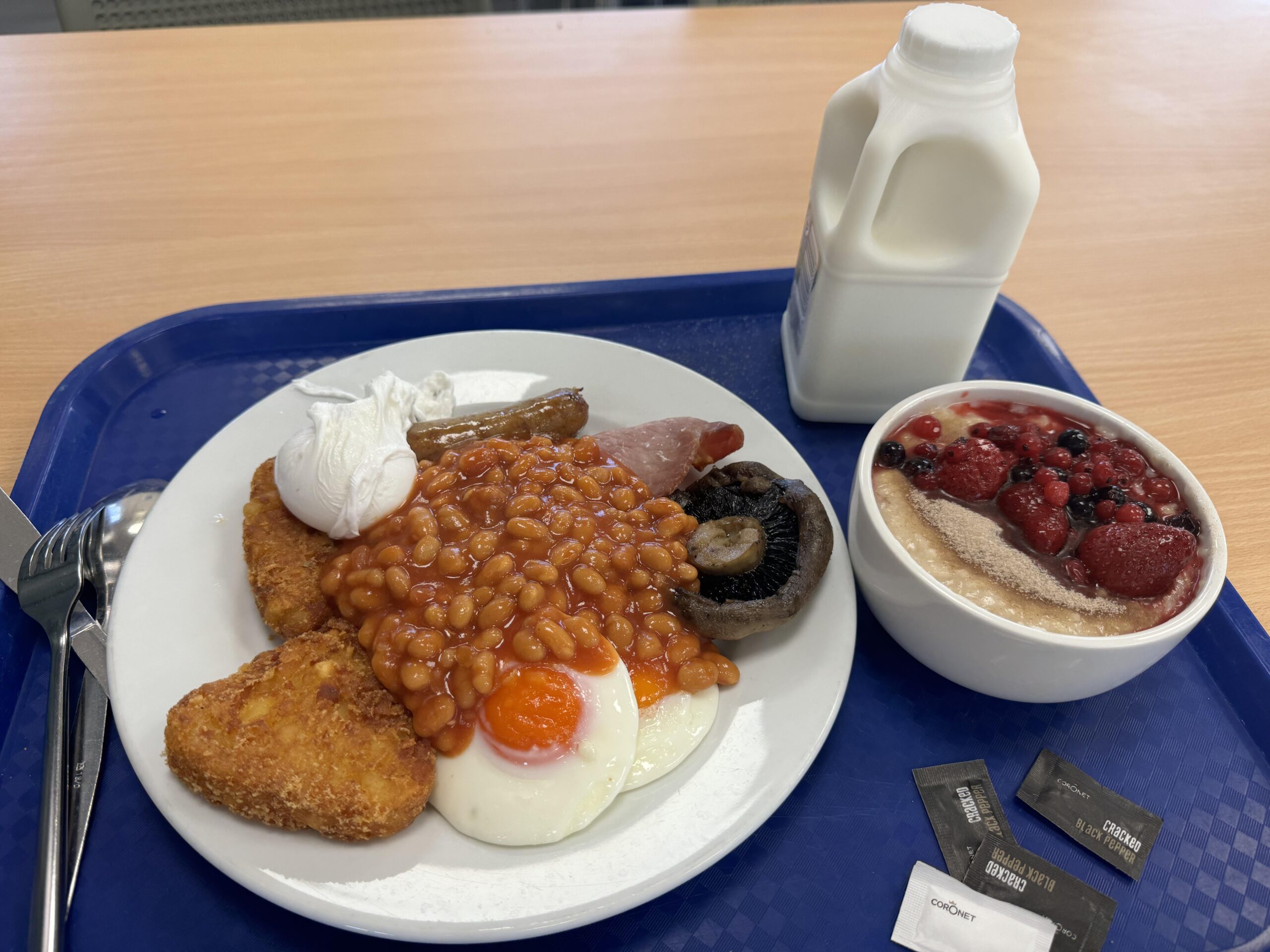 Daily breakfast in the work canteen, tends to be a different price everyday but normally around £5.70. What we giving it out of 10 on looks?