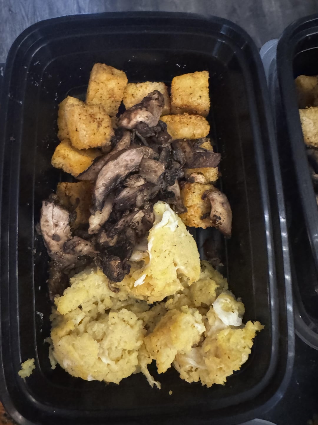 Eating mostly plant based lately: Spinach & cheese frittata with refried beans Orzo bake with spinach (and eventually feta) Cheesy polenta with roasted tofu and shiitake mushrooms Bonus chocolate walnut banana bread loaves