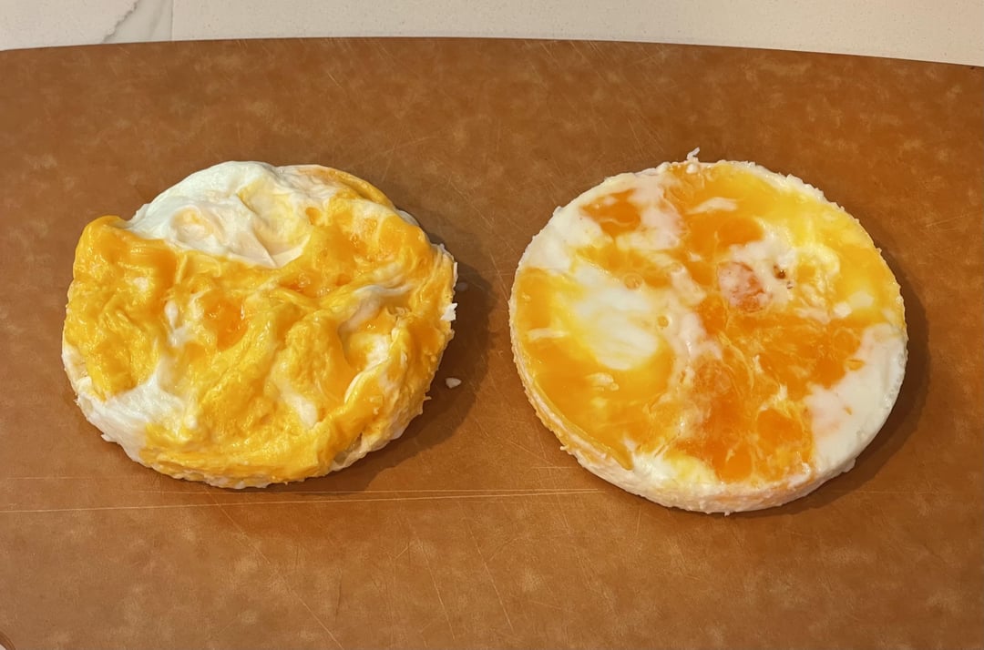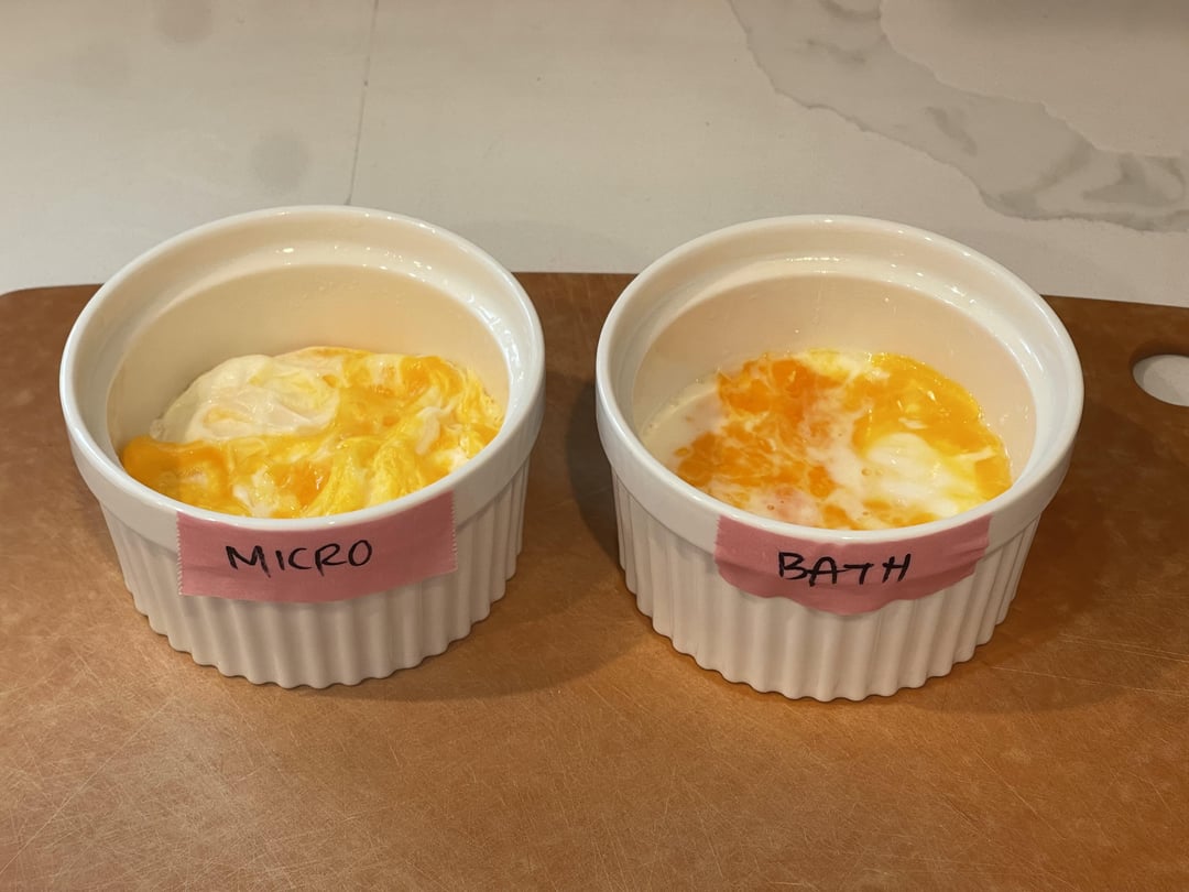 I hope to demonstrate the subtle differences in these two methods. Microwaving is great! But water bath is just different. You can see the differences. The texture of the microwaved puck is more rubbery compared to the creamy texture of the water bath. It also has more air holes which contributes to the difference in texture. It’s also not as consistent. The bottom of the egg is mostly uncooked while the top is almost toasted. And then there’s the obvious shape. It’s not obvious but the microwaved puck actually shrunk like a sponge in the ramekin and wasn’t in contact with the walls by the end of the cook.