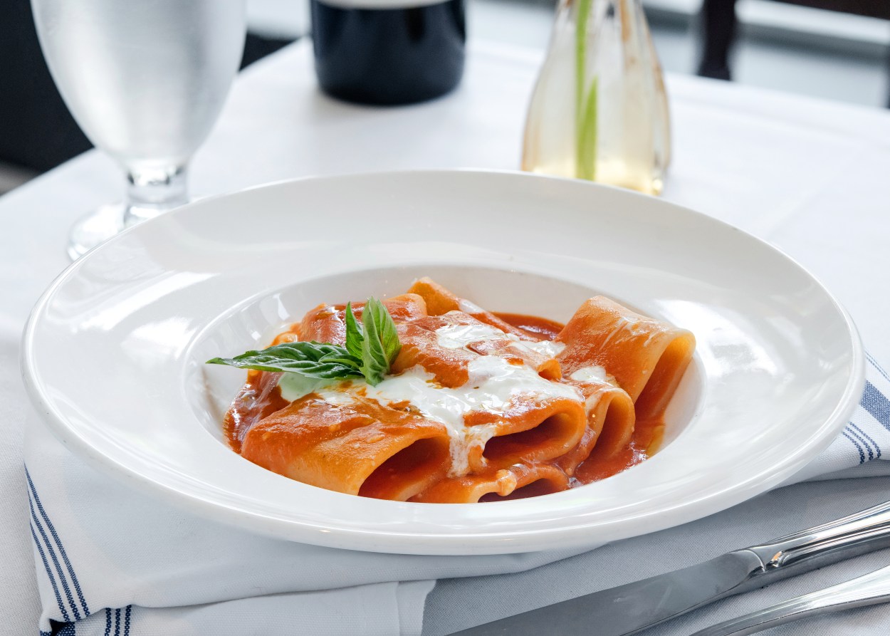 Rigatoni ai Quattro Pomodori with a four-tomato sauce, red onion, basil & calabrese chili , tops with creamy stracciatella. Photo: Steve Hill