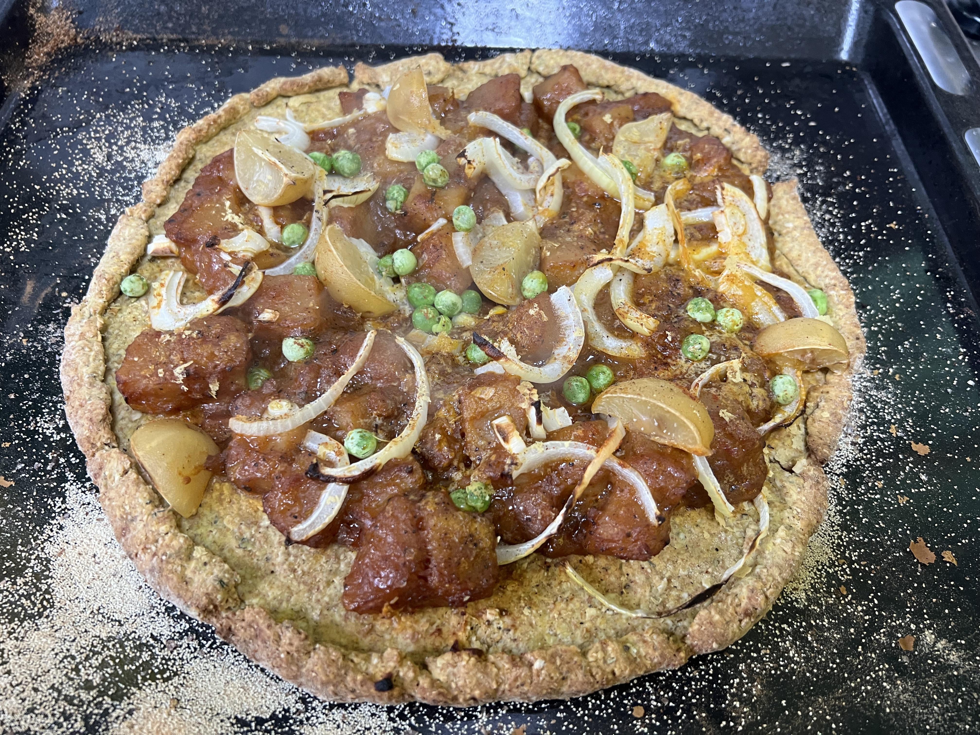 I don’t turn my nose up at any of these ingredients, but this monstrosity should never have been allowed to live: homemade flour and oat base, a tin (A TIN!) of Bombay potatoes, peas, onion, and pickled lemon. Looks more like a Donner kebab than a pizza…