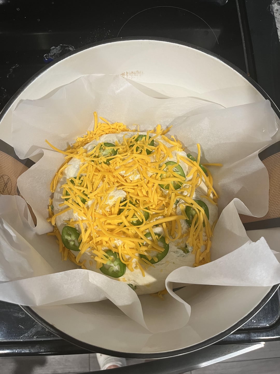 Looks great! Things to experiment with is incorporating the peppers into the dough during the kneading or folding steps. Also filling the bottom of your proofing container with the cheese then putting topside of dough down first. It will embed nicely.