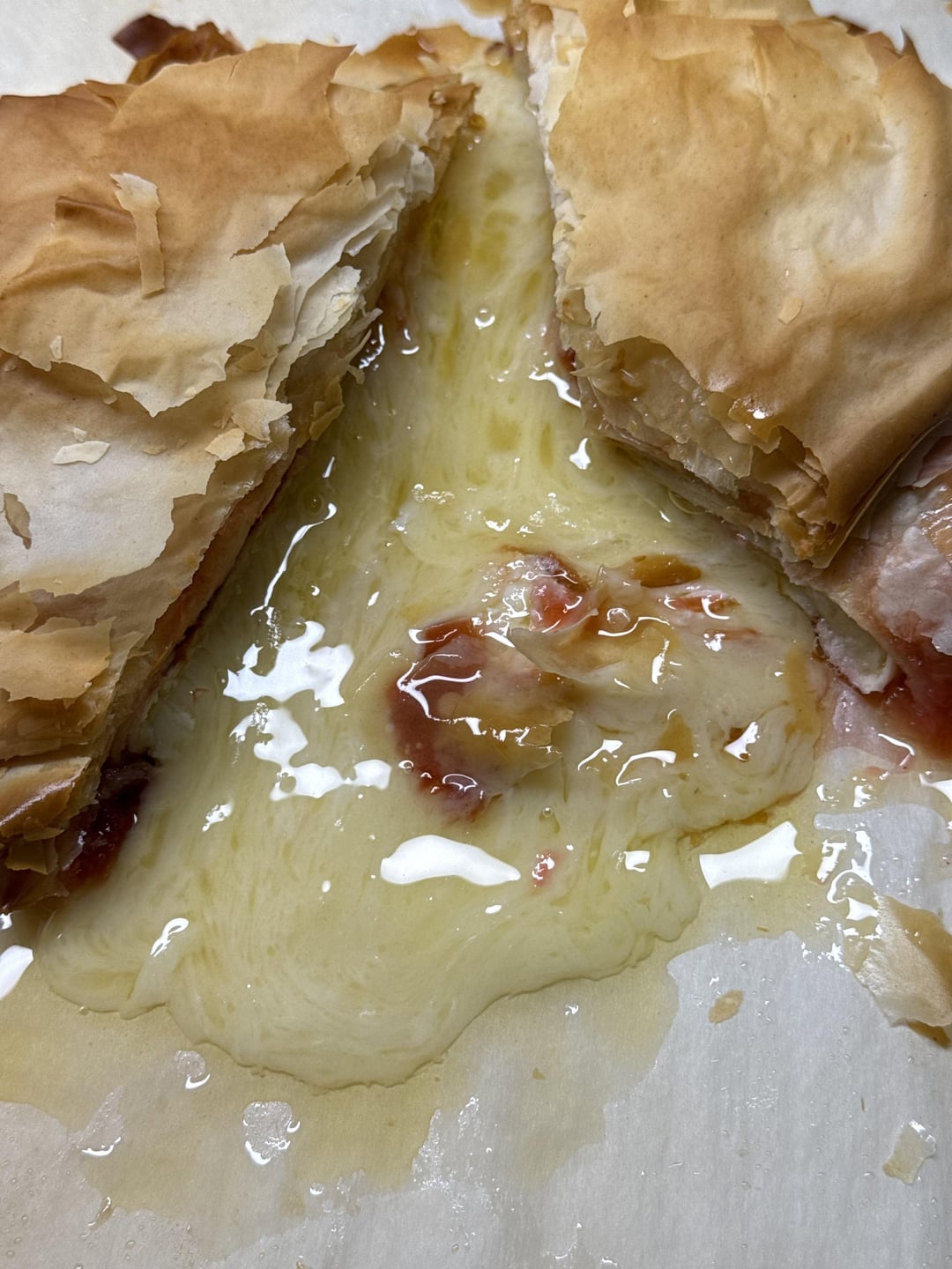 I used a Saint Rocco Triple Cream Brie, homemade strawberry and rhubarb jam and 6 or 7 sheets of fillo dough. Brush parchment paper with olive oil. Brush each layer of dough with olive oil. Spread jam over cheese and flip over onto dough. Spread jam on the other side. Gently fold dough, i did corner to corner. Brush with olive oil again. Bake at 400 for 25 minutes. Let rest for 40 minutes.