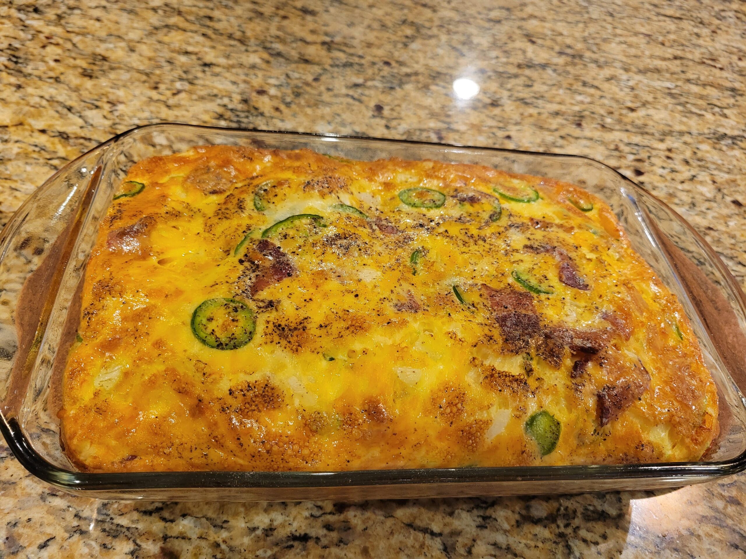 9 large eggs, some heavy cream, shredded cheeses left from another meal, plenty of cooked butcher cut bacon left from a few days ago, thin sliced jalapenos from another meal, and finely diced onions from yet another meal. There are less than 10 carbs in this entire dish and it's at least 4 meals. Well, maybe 2 for me. It might look a little dark/burnt, but it's far from it.