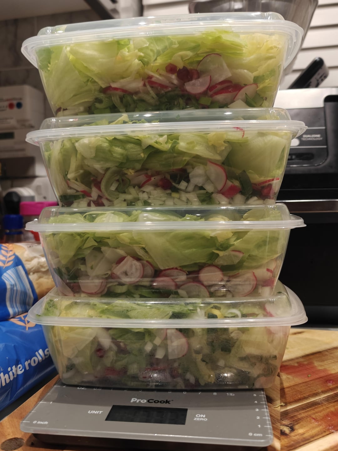 Turned into 4 lettuce, radish, sprungion, and pomegranate salads, ready to be dressed in a honey lime vinaigrette.