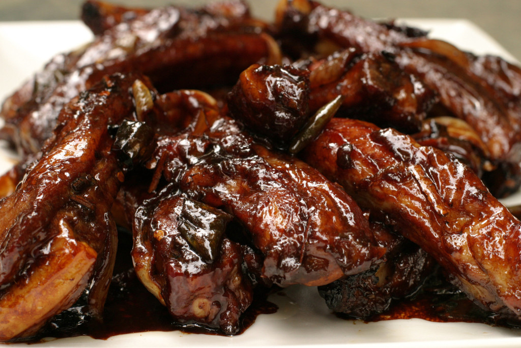 - Place ribs in a large plastic bag and set aside. In a bowl, combine lime zest and juice, soy sauce, chilies, ginger, oil and 2 tablespoons molasses. Add star anise, cinnamon, onion and pineapple juice, and stir to mix well. Add contents of bowl to bag, seal bag well, and refrigerate overnight.