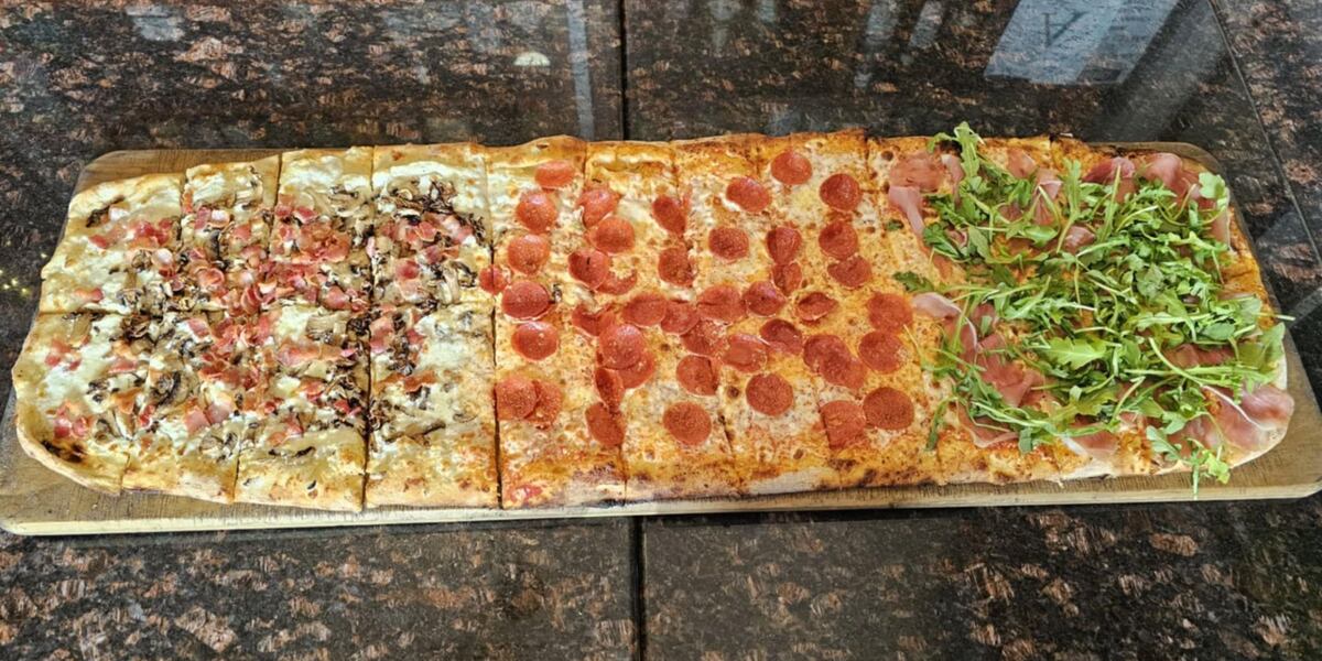 The rectangular pizza is 39 inches long and makes around 20 to 22 slices—great for parties or gatherings. The meter-long pizza is on the menu and is made daily. Customers can order one of the set pizzas, have up to three pizzas at once, or customize and build a pizza to their liking.
