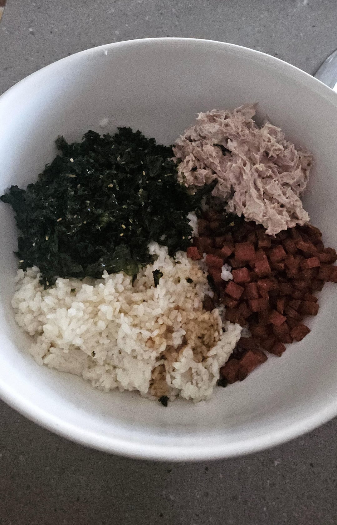 I soaked the spam in hot water for a few minutes then chopped and cooked it to how I like it (crispy).
