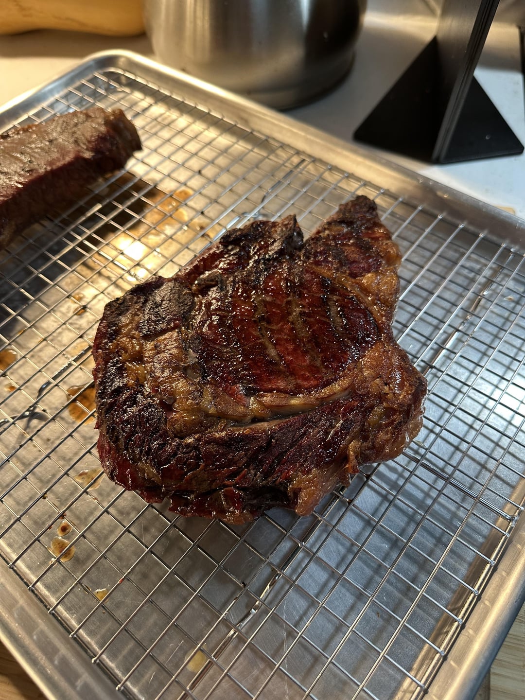 Smoked until 125 internal. Rested 10-15 min (I didn’t set timer). Seared on stainless steel with avocado oil and almost set off the fire alarm. It’s a damn good steak.