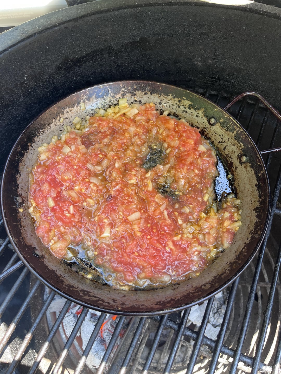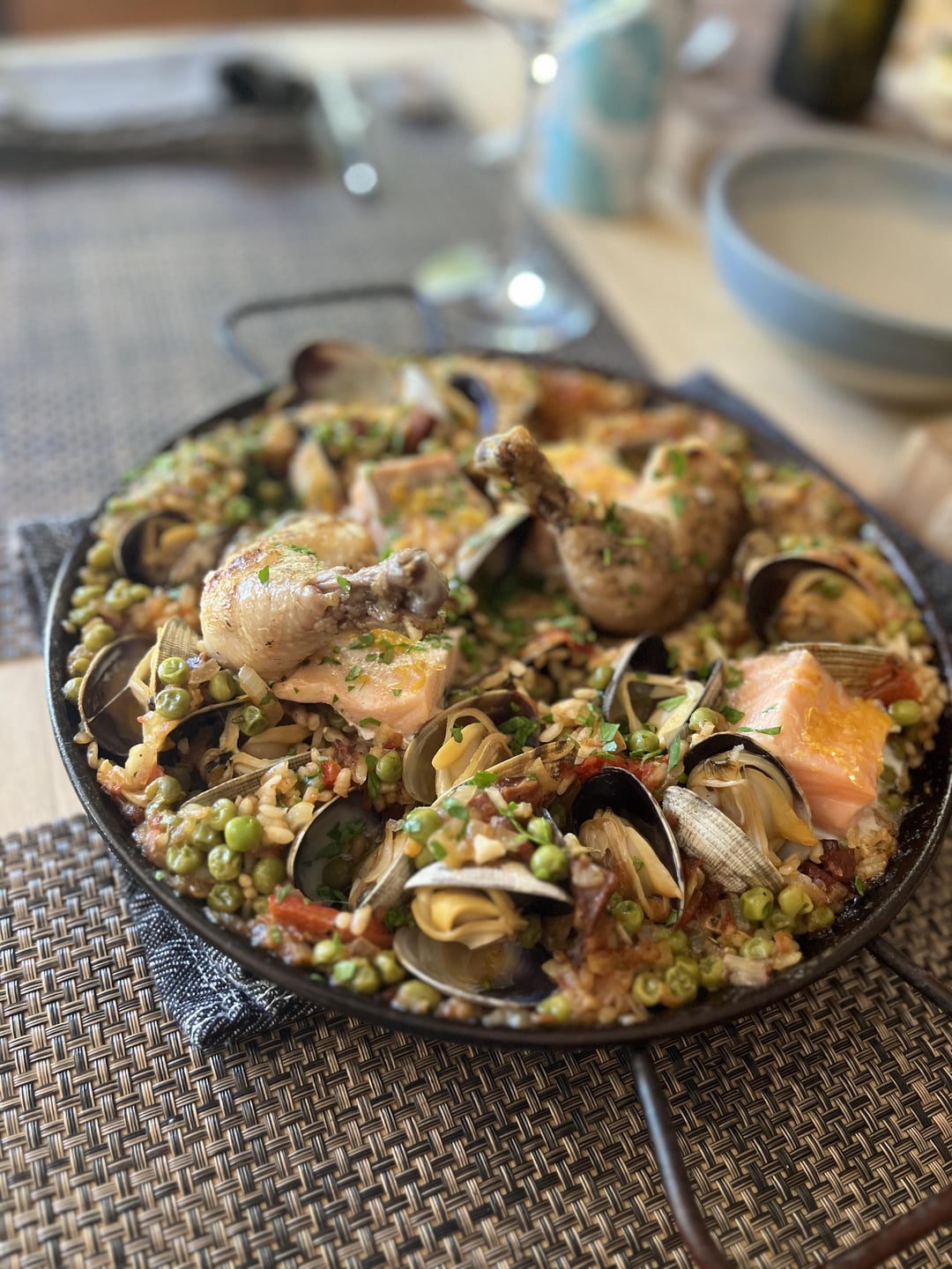 Hen legs, Spanish chorizo, onion, tomato pulp, rice w saffron, smoked paprika, rosemary, crab stock, peas, roasted red peppers, clams and salmon steamed over latent heat.