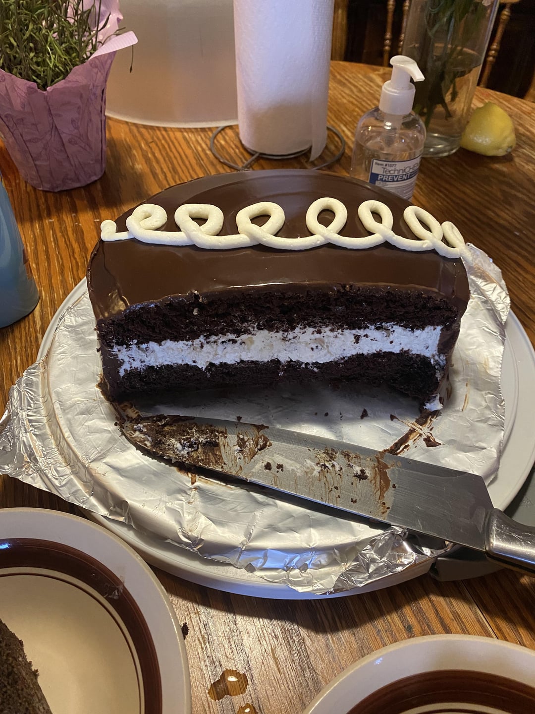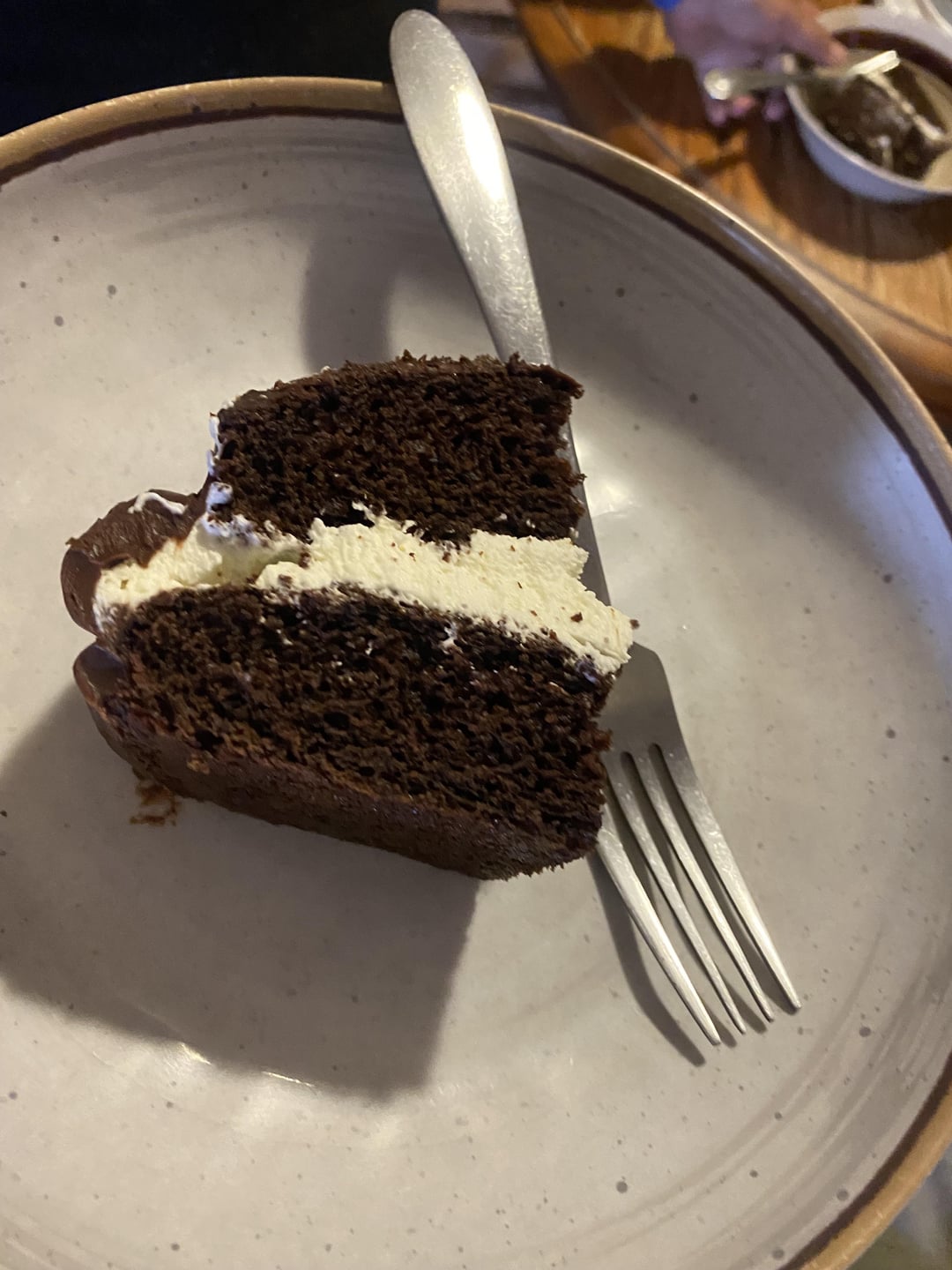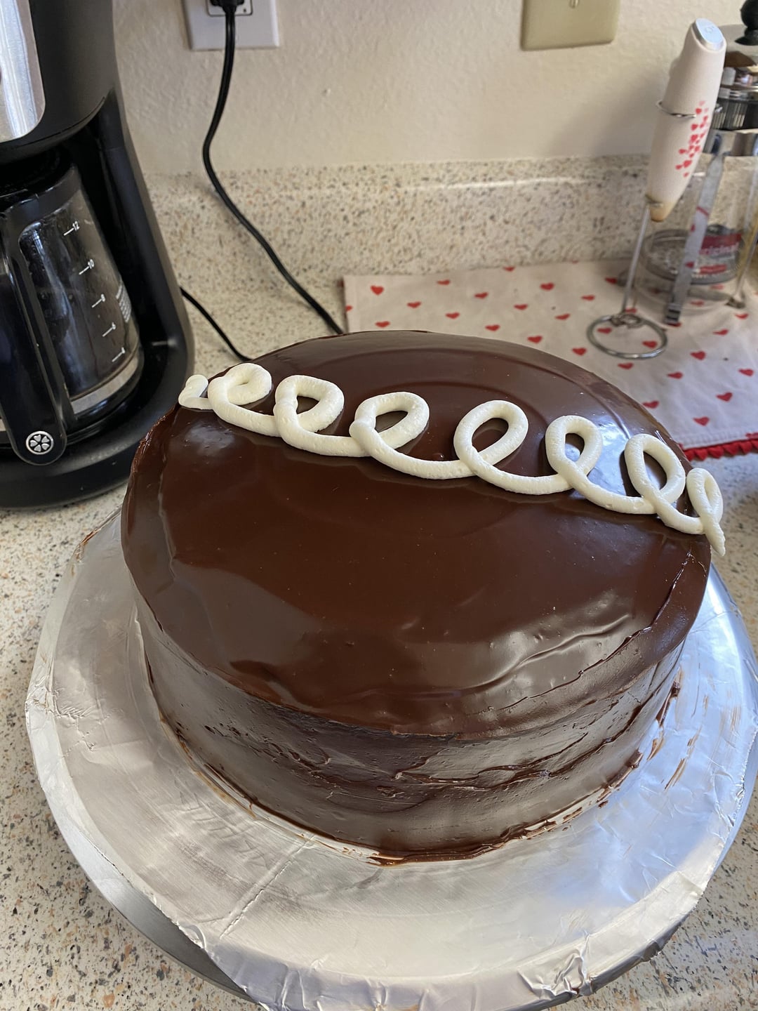 Chocolate cake with a homemade whipped cream center and topped with a chocolate ganache.