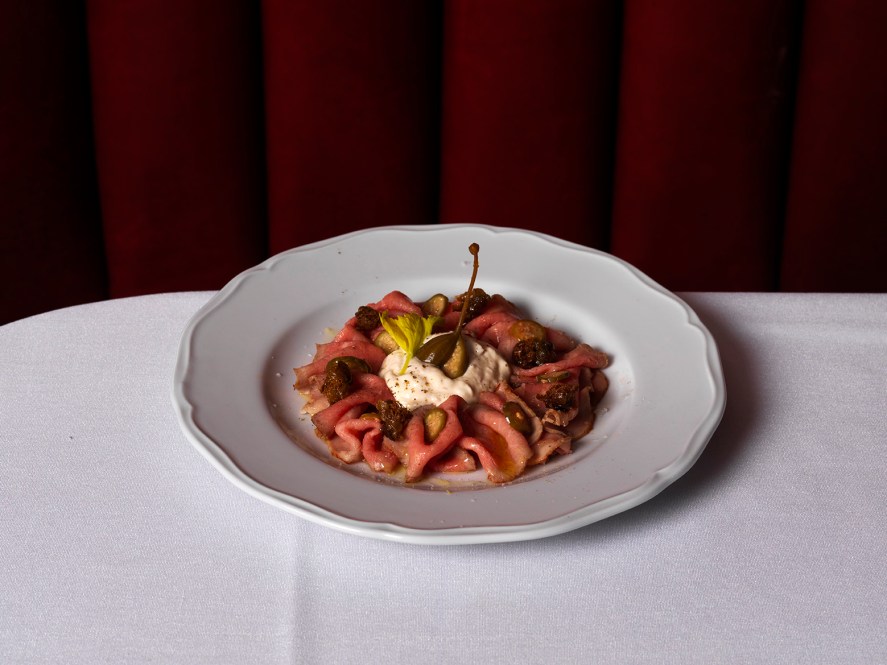 Tajarin pasta (also known as tagliolini or taglioni) is a traditional dish of Piedmont. Neptune’s pairs thin egg yolk noodles with a modest tomato and basil sauce. Then there’s beef battuta, an Italian take on French tartare made with diced topside steak. “We mix it with parmesan garum [made using rinds] we source from a local chef and top it off with parmesan and hazelnuts from Piedmont,” says Pepperell. “The dish is very northern. I guess that part of Italy has more money, so they can afford to eat beef and use butter, expensive hazelnuts, and parmesan Reggiano.”