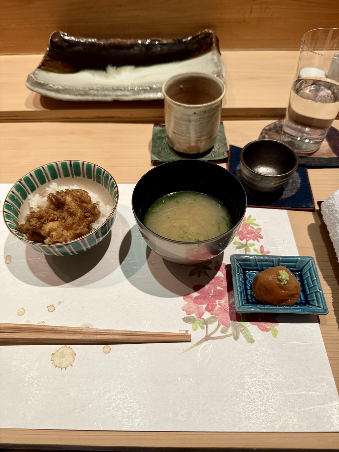 Scallops, rice sweet soy sauce pickled plum and miso soup