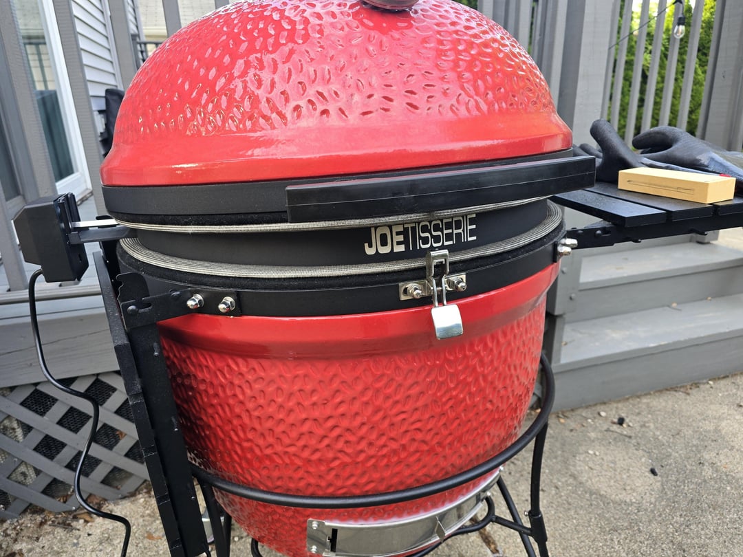 I hold the lid down with a bungee cord to get a better seal for low and slow cooks with the joetisserie