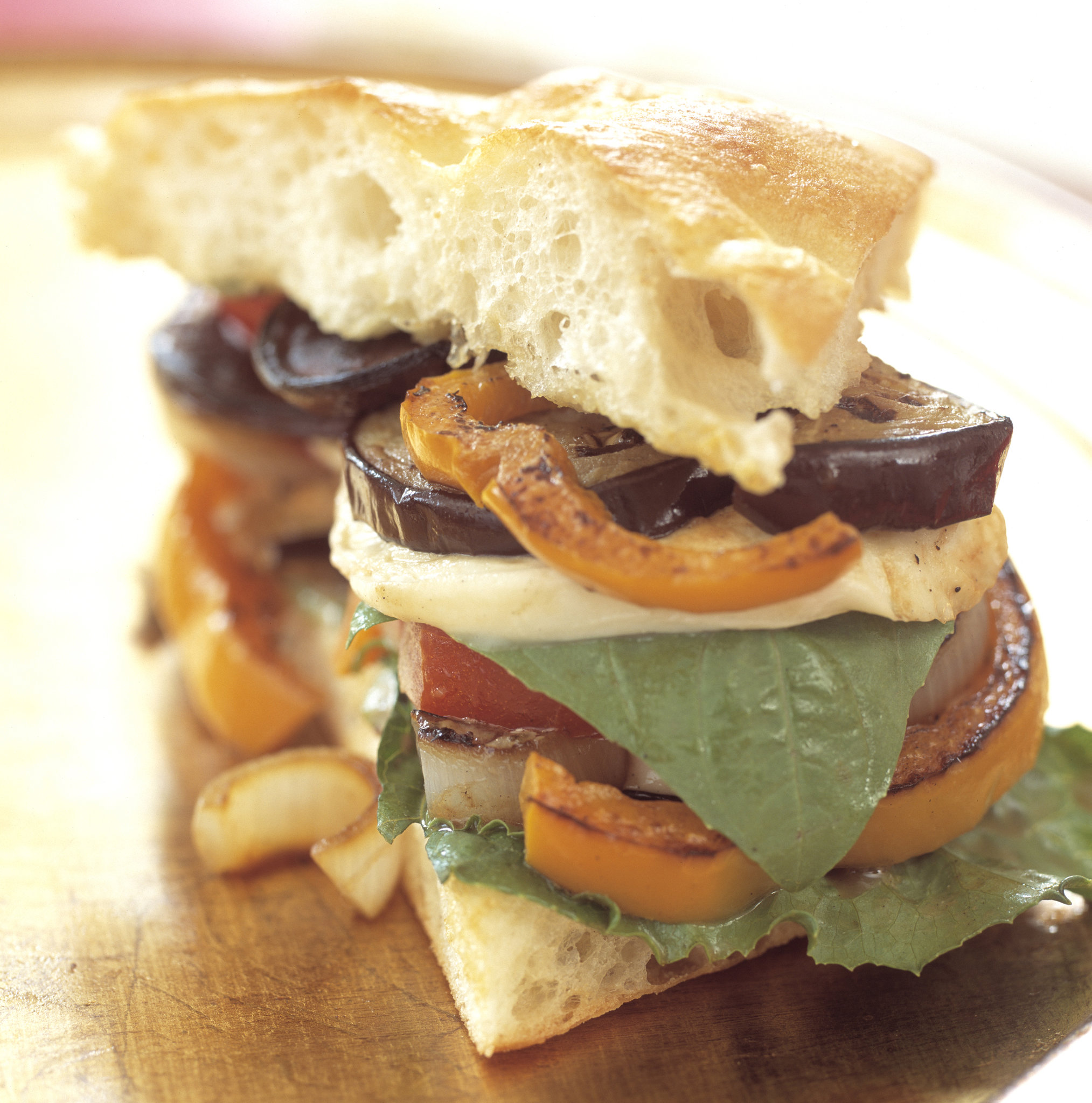 - To build sandwiches: Spread focaccia slices with mayonnaise. Layer onions, peppers, eggplant, tomato, cheese, basil and romaine in an order that pleases you. Cut and serve immediately.