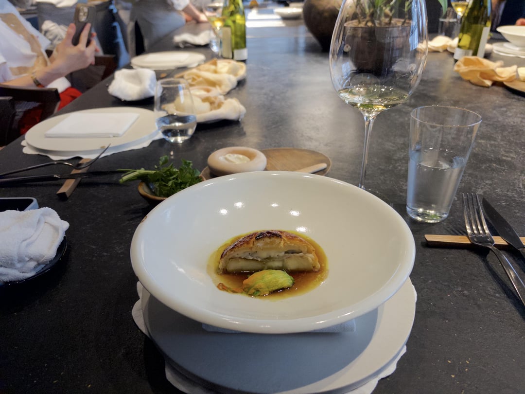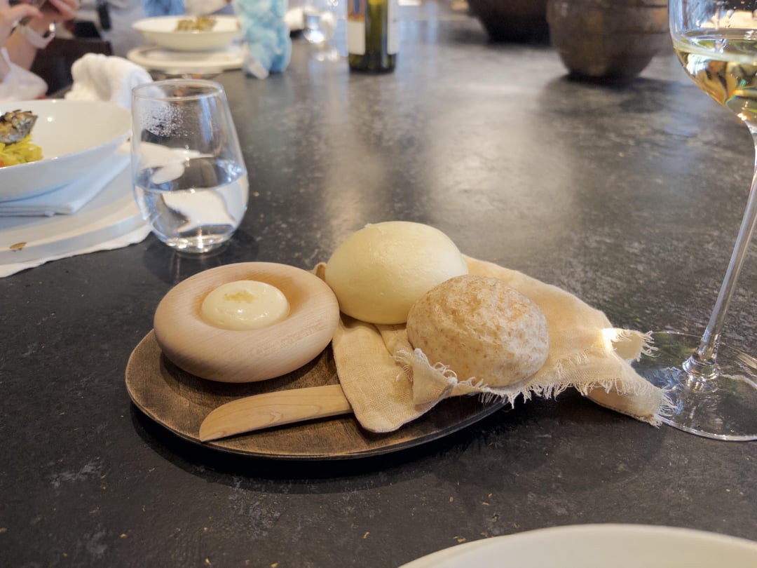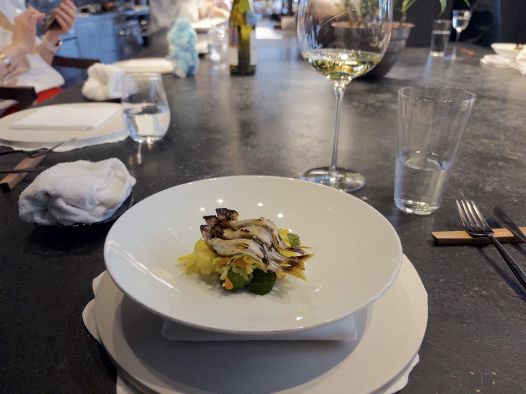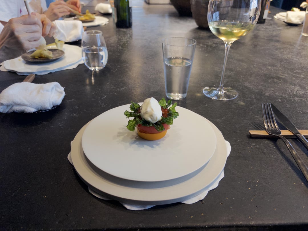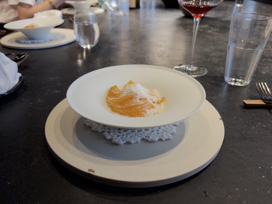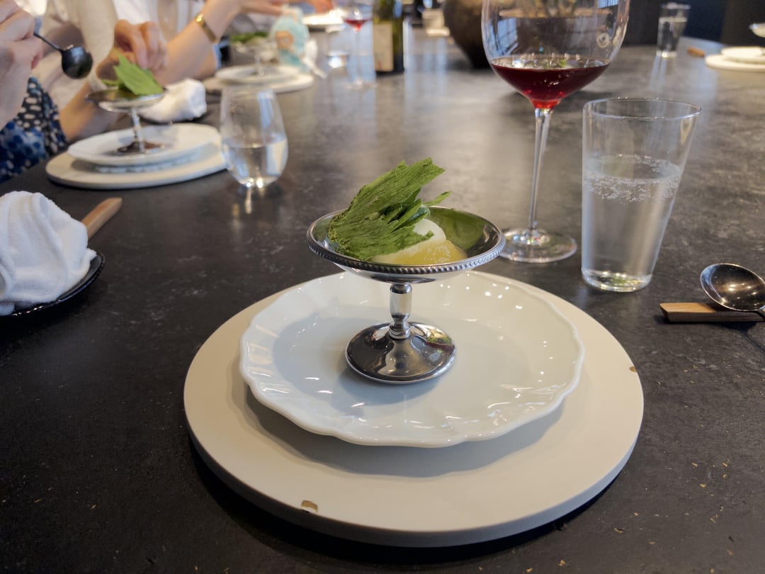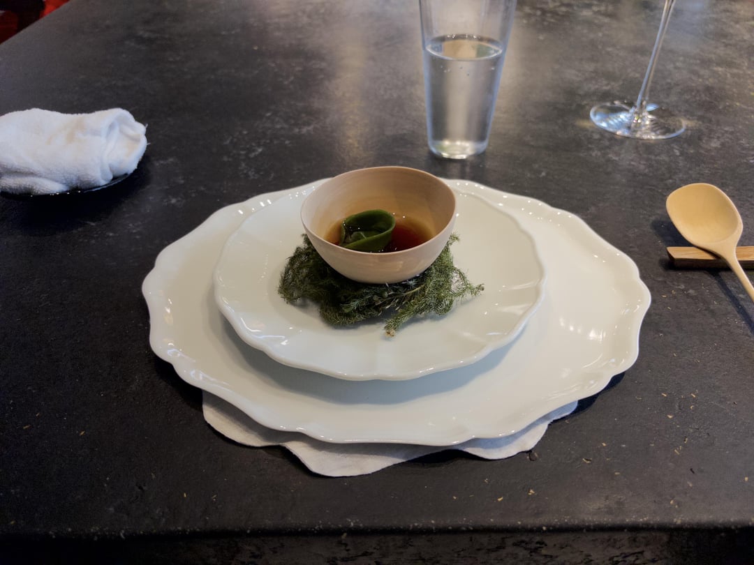 Ambiance: Beautiful space with the open kitchen and the communal tables, though there were only 6 people on our end. We got a nice view of the chefs prepping and plating, including Head Chef Kawate carving the duck. We were sat at the end of the table next to the entrance and doors into the kitchen, so to be honest I wouldn't describe it as a relaxed space with the waiting staff in constant movement around us. The music was also kind of electronic beats in what I'd best describe as "driving." All in all, it might work for a lunch vibe, but not my preferred style of relaxed dining.