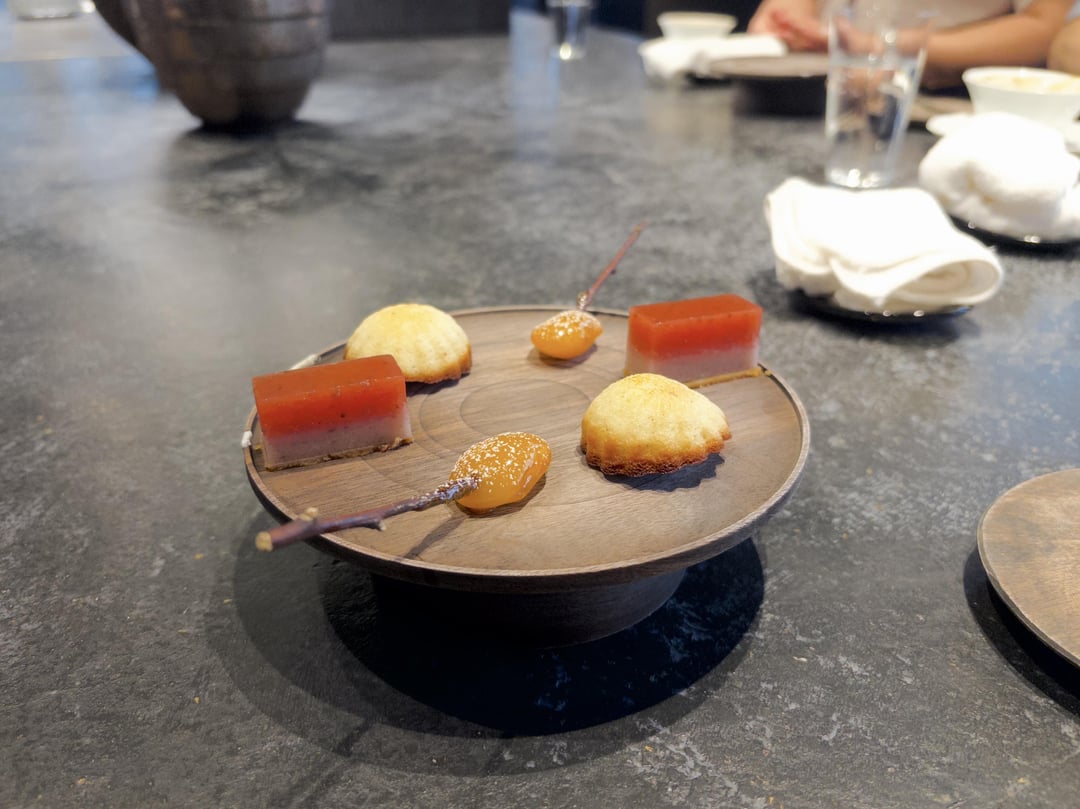 - Financier, strawberry jelly, white bean confit and apricot jam and ginger powder: Pretty good mix of different sweets: financier like a vanilla sweet, the jelly a tart sweet, and the bean like a red bean kind of sweet.