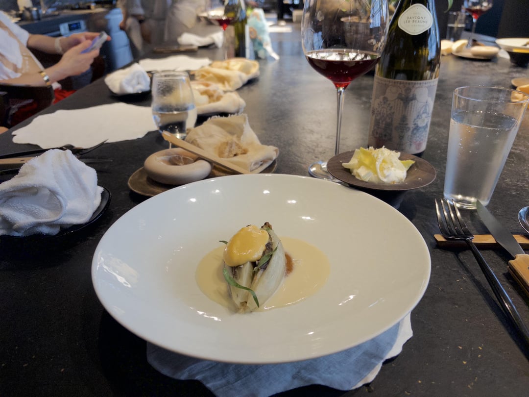 - Endives with plum sauce, cookie, tarragon, egg cream: This was only for the veggie menu. The cookie is genius as it adds a salty, buttery, and umami dimension to the nutty bitter endive.