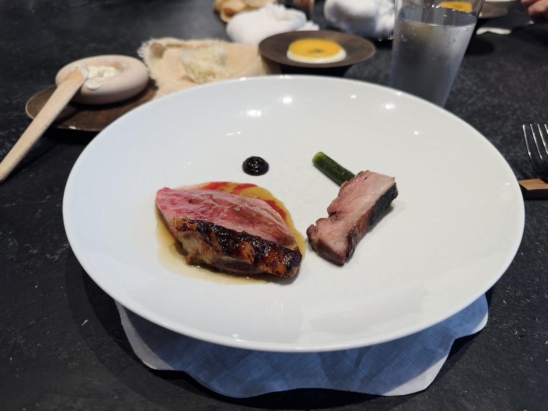 - Duck breast and leg with consommé, spinach paper roll with bean paste, kombu concentrate: This was only for the meat menu. Excellently cooked duck! I saw other diners get pork belly instead.