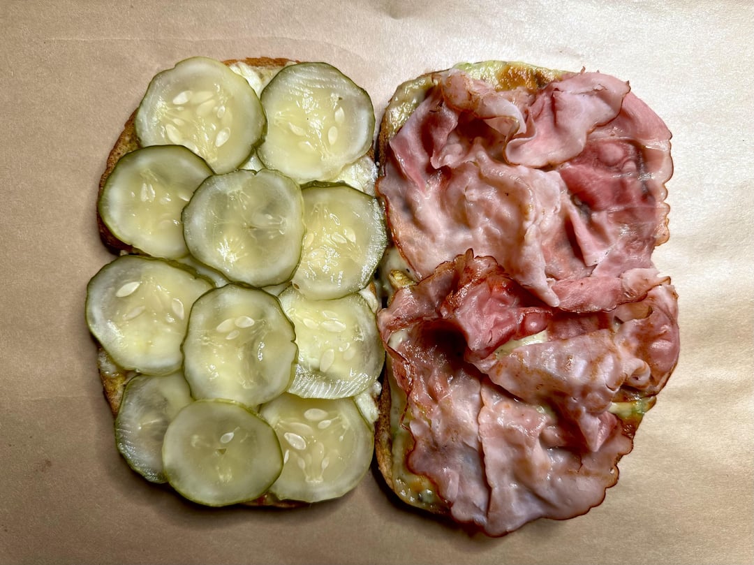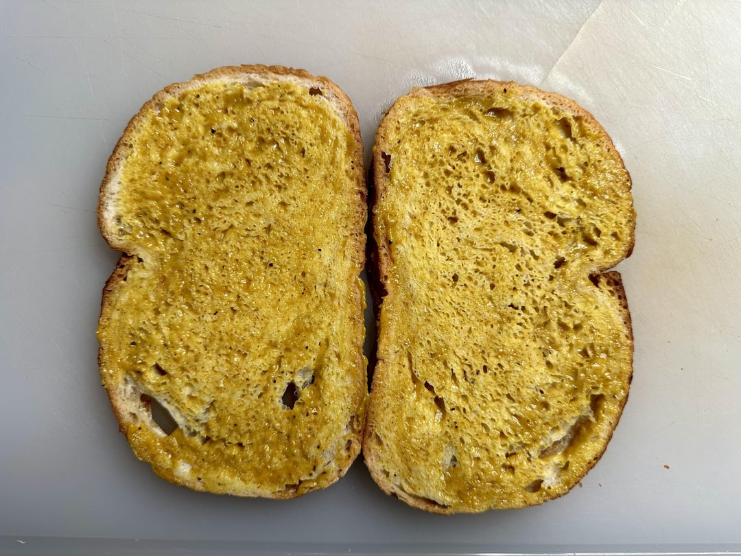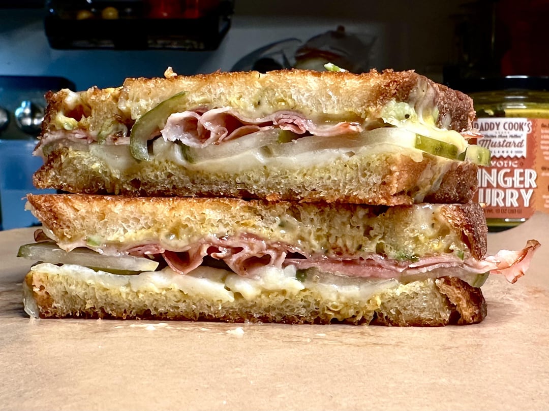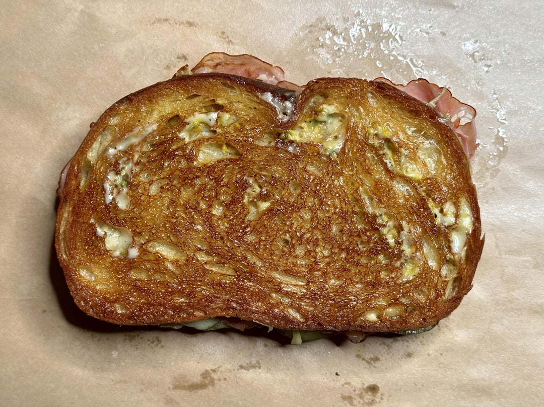 Homemade rustic white bread, Kerrygold butter, ginger curry mustard, homemade American cheese with scallions, mozzarella and smoked Scamorza mix, ham, and homemade mustard pickles. Bread grilled with a weight and then cheese melted in the oven.