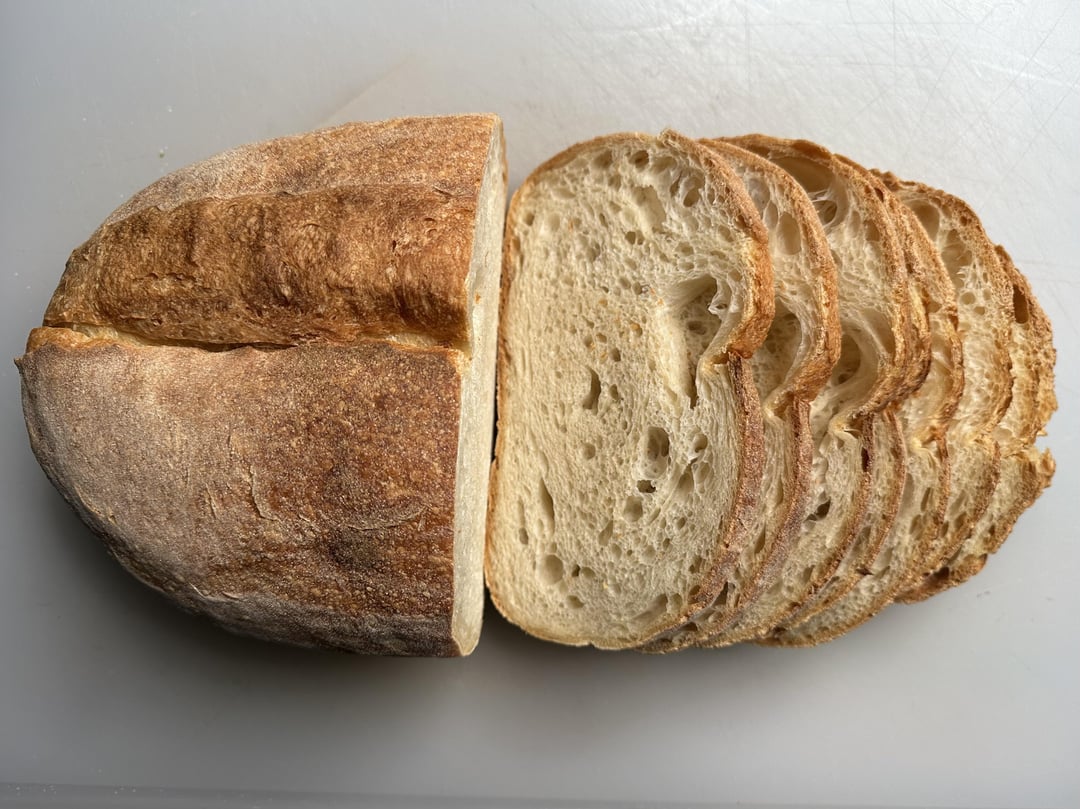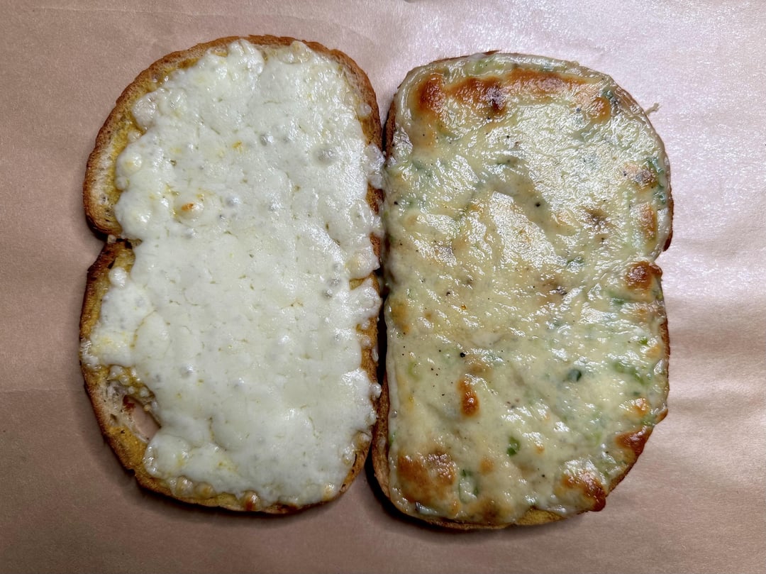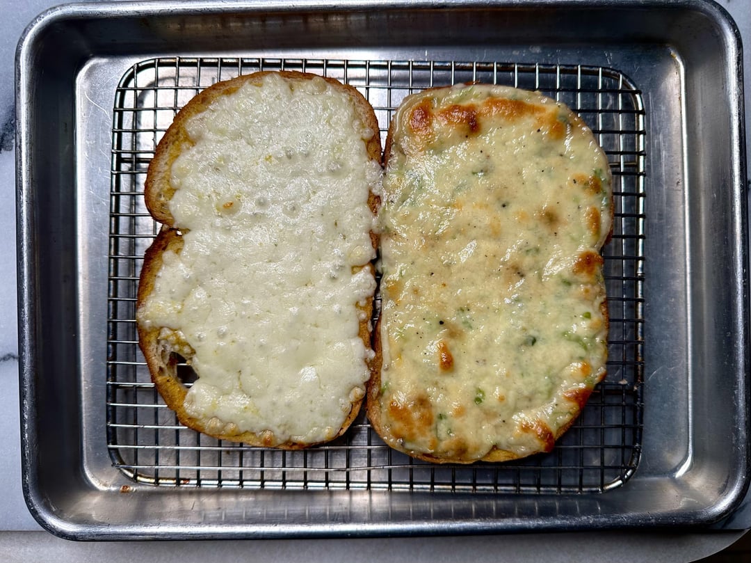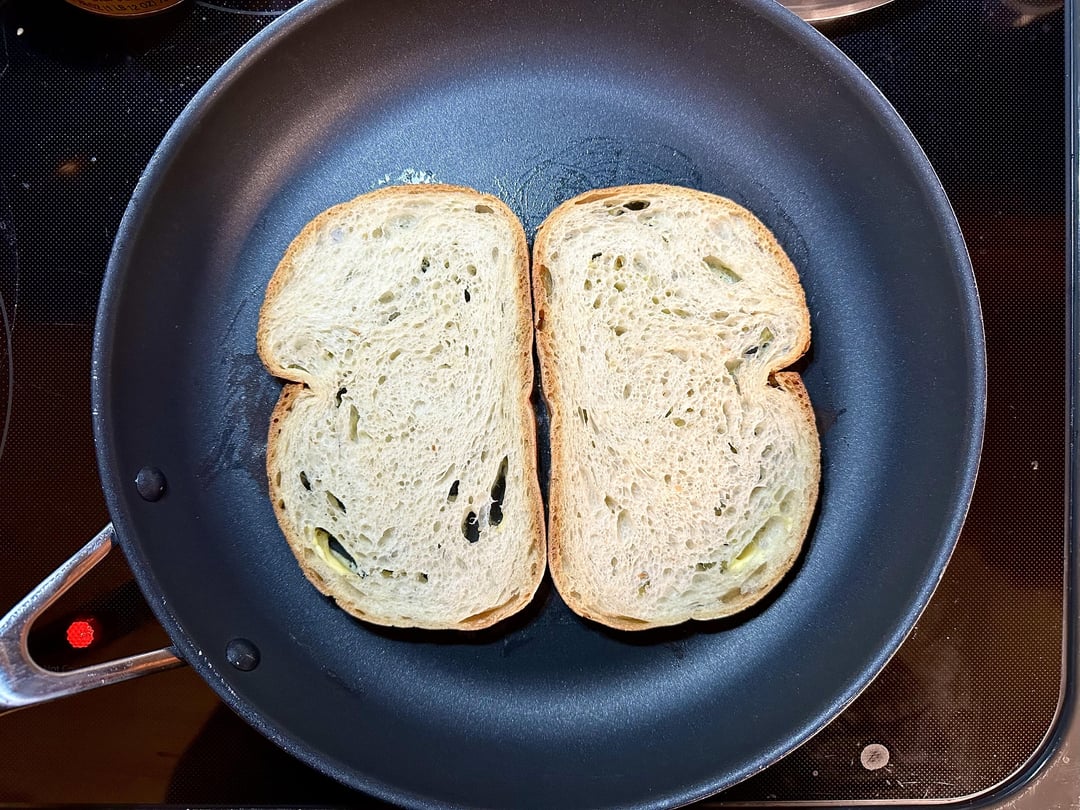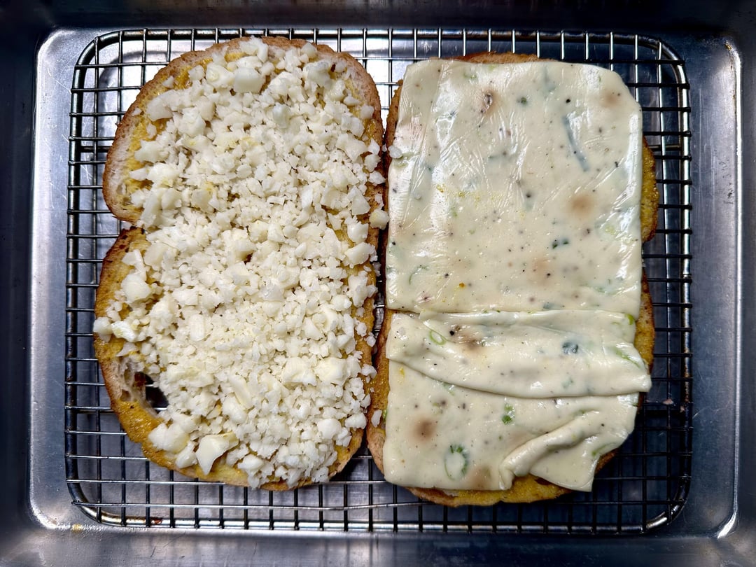 Homemade rustic white bread, Kerrygold butter, ginger curry mustard, homemade American cheese with scallions, mozzarella and smoked Scamorza mix, ham, and homemade mustard pickles. Bread grilled with a weight and then cheese melted in the oven.