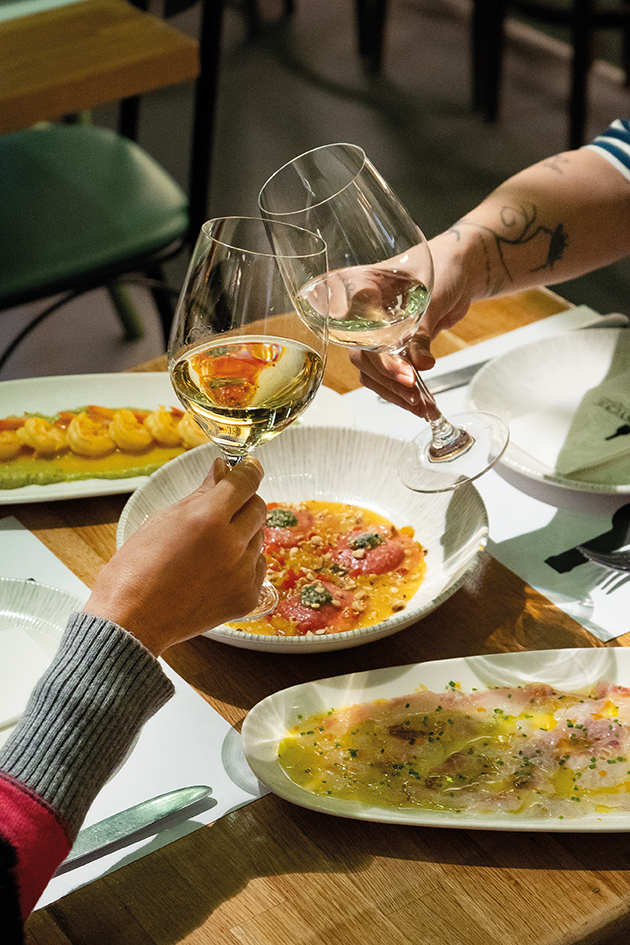 The food here is anything but an afterthought. Dishes like scallop crudo with kumquat and radish, lemon spaghetti with pistachio, or grilled squid with artichoke and smoked kale are a perfect match for the wines. Sophisticated yet unfussy, it’s food designed to support every sip.