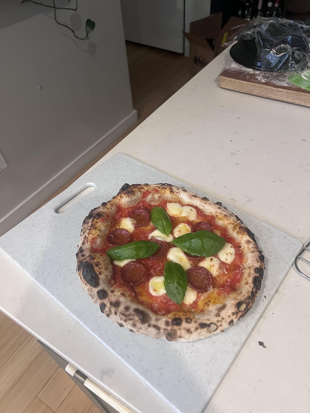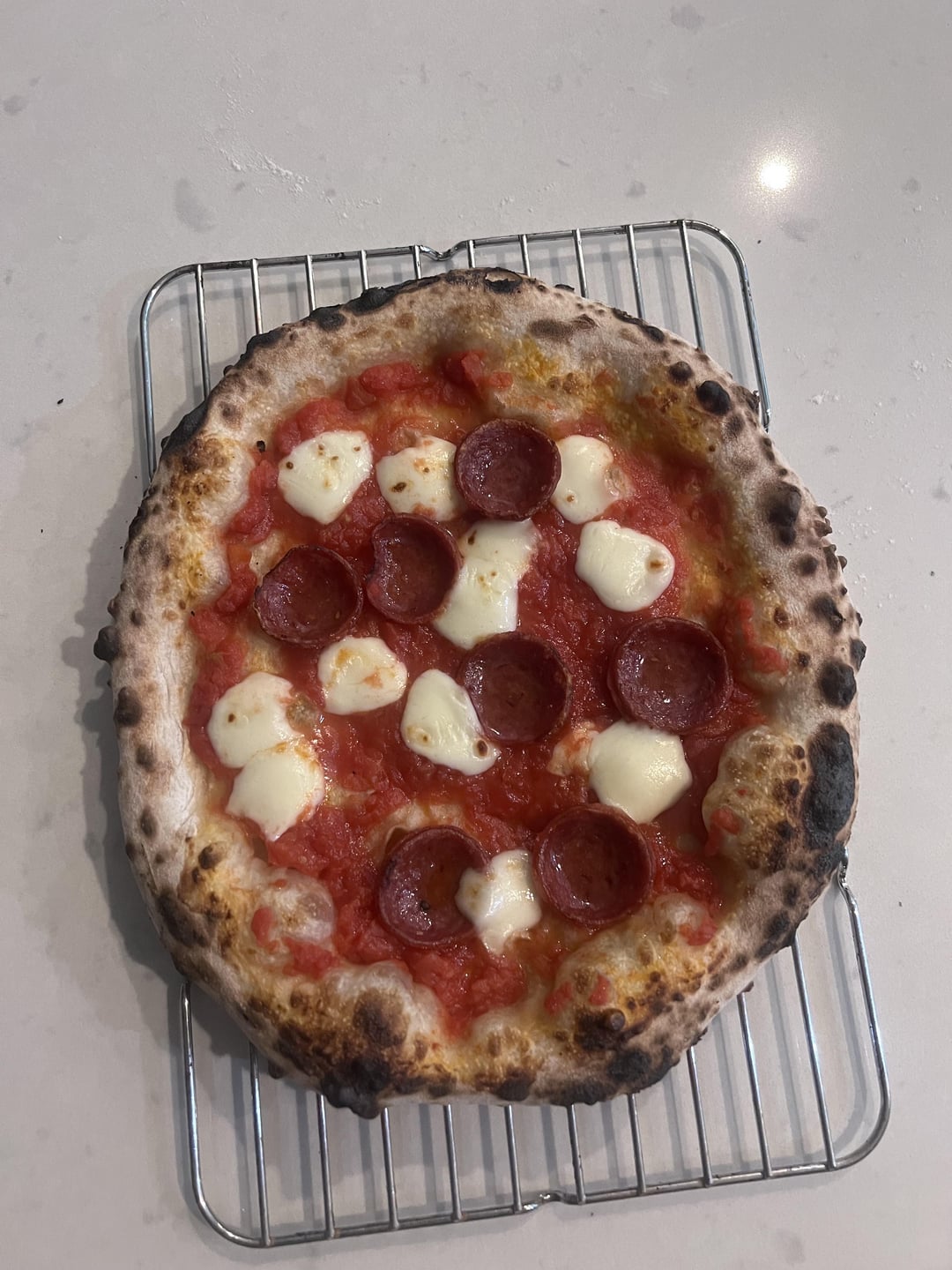 Recipe is above. I followed the recipe scaled to 4 balls instead of 6 and adjusted the final flour/water ratio to get it to 65% hydration. 72H final cold ferment. Baked in an ooni.