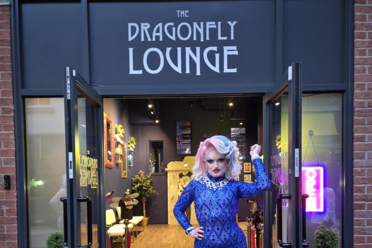 Venue – Drag queen Samdrogyny outside The Dragonfly Lounge (Image: The Dragonfly Lounge)