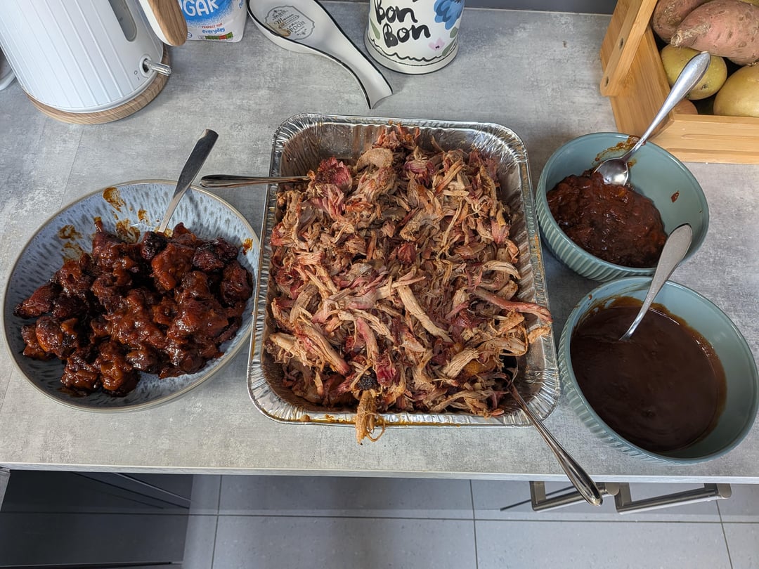 Pulled pork with smoked apple BBQ sauce, pork belly burnt ends with voodoo peach jalapeno sauce. I am stuffed.