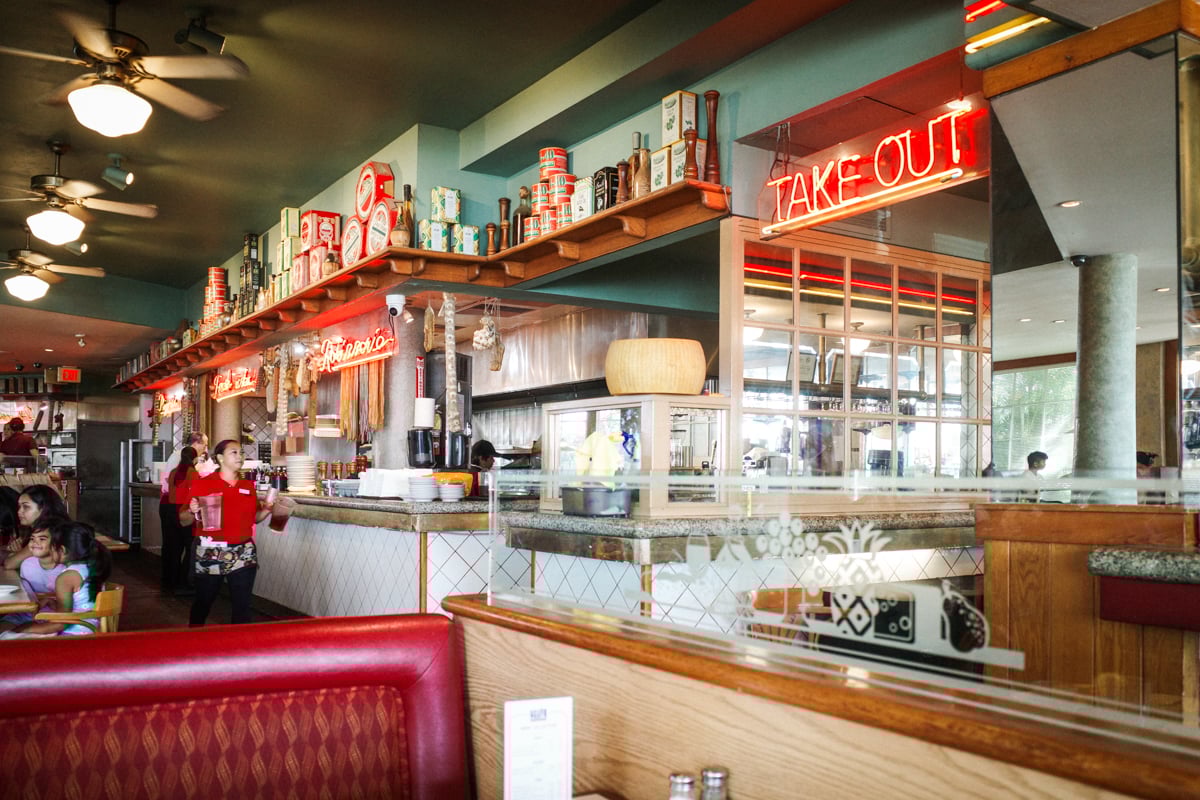 Stepping into the sunny atrium is such a contrast to the dark red dining room accented by neon signs listing takeout, cappuccino, pizzeria, fresh pasta and rotisserie. As a kid, I always wondered if they ever used the hanging dry pasta in the kitchen. Were the tomato sauce cans and jars of olives real? And did they make fresh desserts on the display table every day or were they just fake?