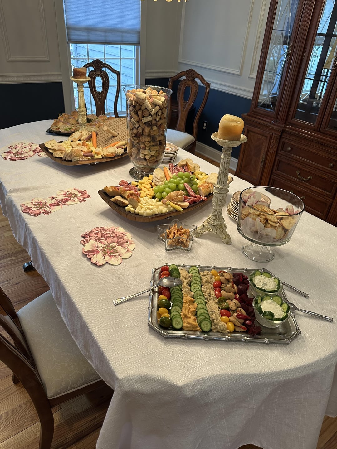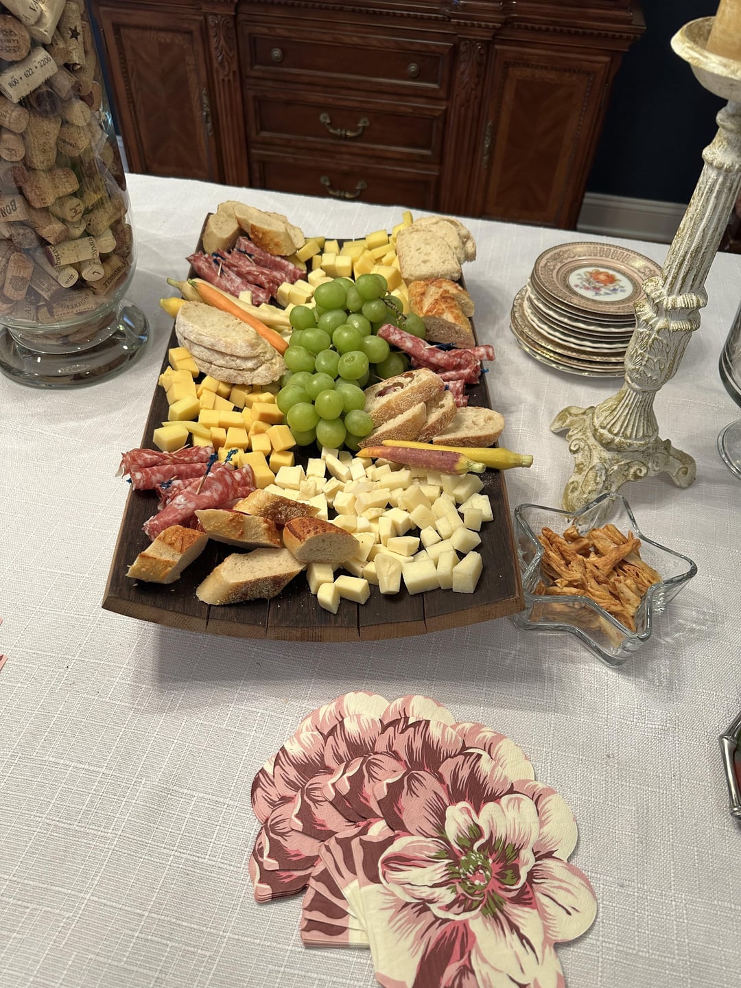 I love pairing cheese with wine, I try to find complimentary flavors, but I find opposites work well too. I love soft cheese, but they are hard to pick at in a cocktail party setting. This large circle is a cracker- very bland but plays well with really deep dark cherry cabs and Swiss cheese (my fave):