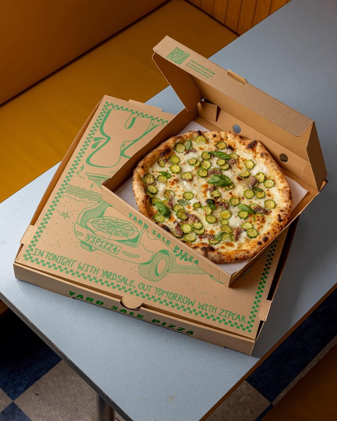 Pizza Bianco with Mozzarella di Bufala Campana, Parmigiano-Reggiano and Pecorino Romano, baby courgettes, Cantabrian anchovies, chilli flakes and basil.