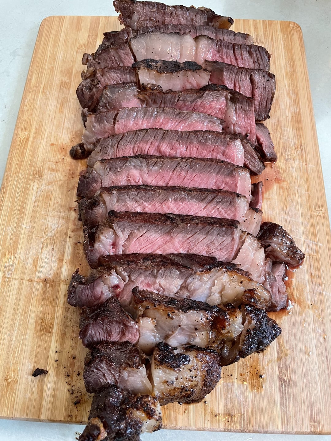 I know some will disagree with me (to each their own), but I don’t give a care about the little bit of grey band. The fat rendered perfectly and the steak looks tender. That means more to me than the width of the band. Less grey band might’ve meant less fat rendering.