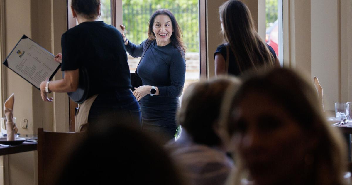 Danielle Theobald enters Volpe and greets friend Amy Clark for dinner Wednesday, April 2, 2025, in Charleston.
