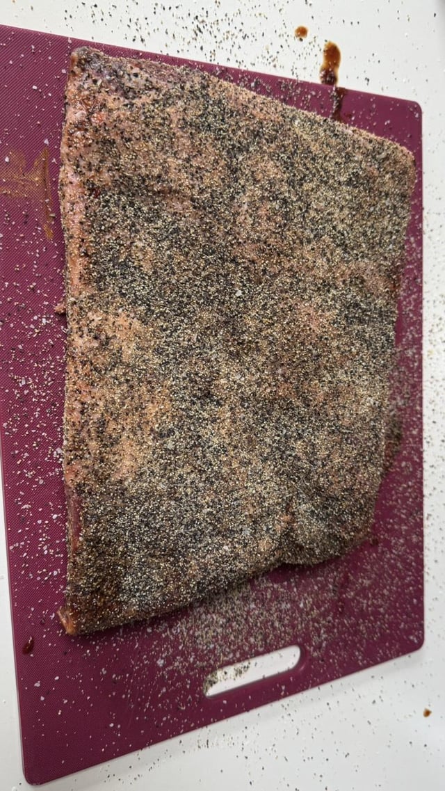 While that was going applied a binder of some Cosmic Dumpling hot sauce. Applied some salt, pepper, garlic much more liberally than before in an attempt to get a bark.