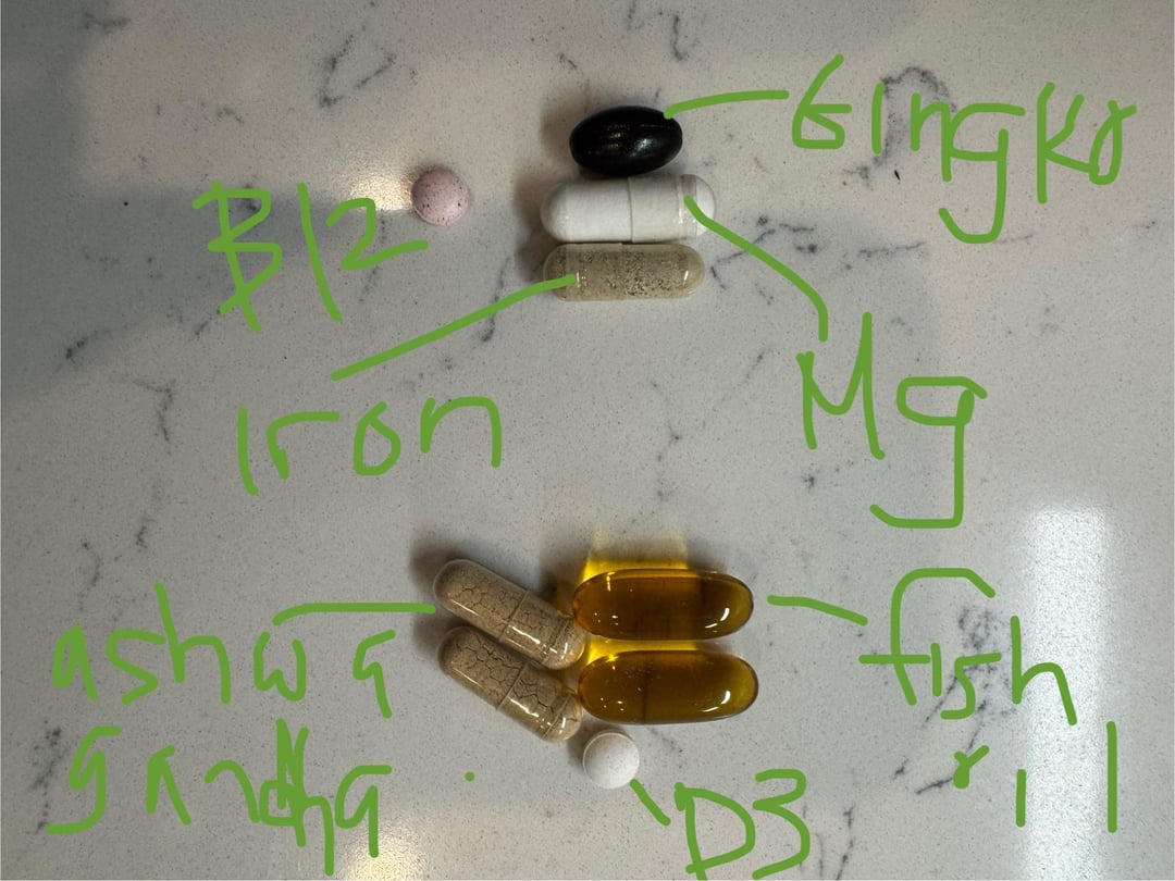 I take B12, D3, Algae for Omegas, Magnesium and Iron