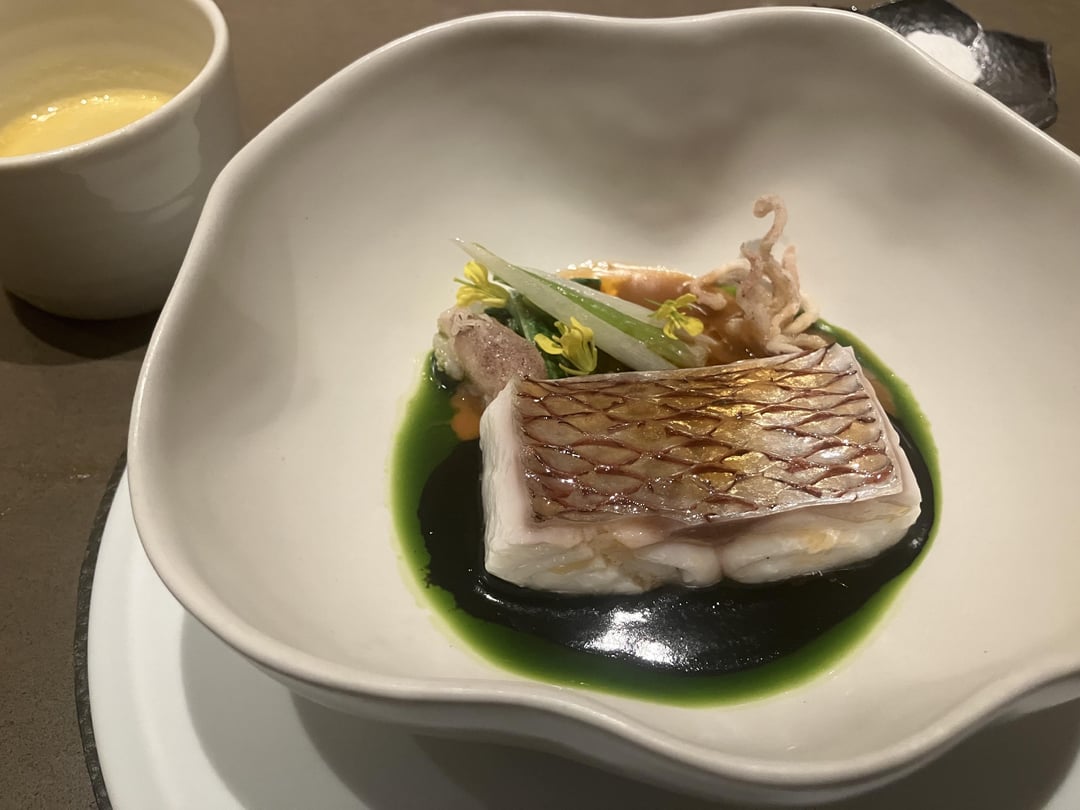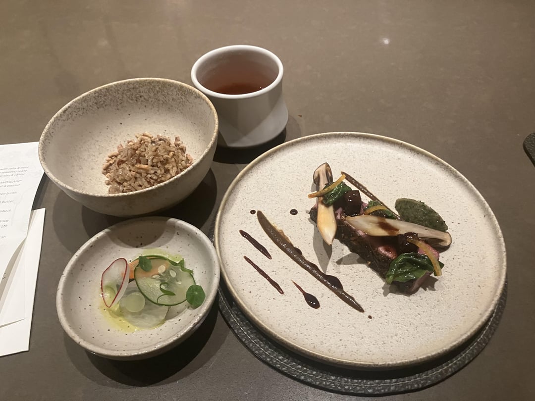 Red Sea perch came perfectly steamed with blackened onion sauce, crab reduction, and fried squid. This dish was executed well but didn’t hit it home for me 100%. The lemongrass coconut broth on the side was delightful, at least.