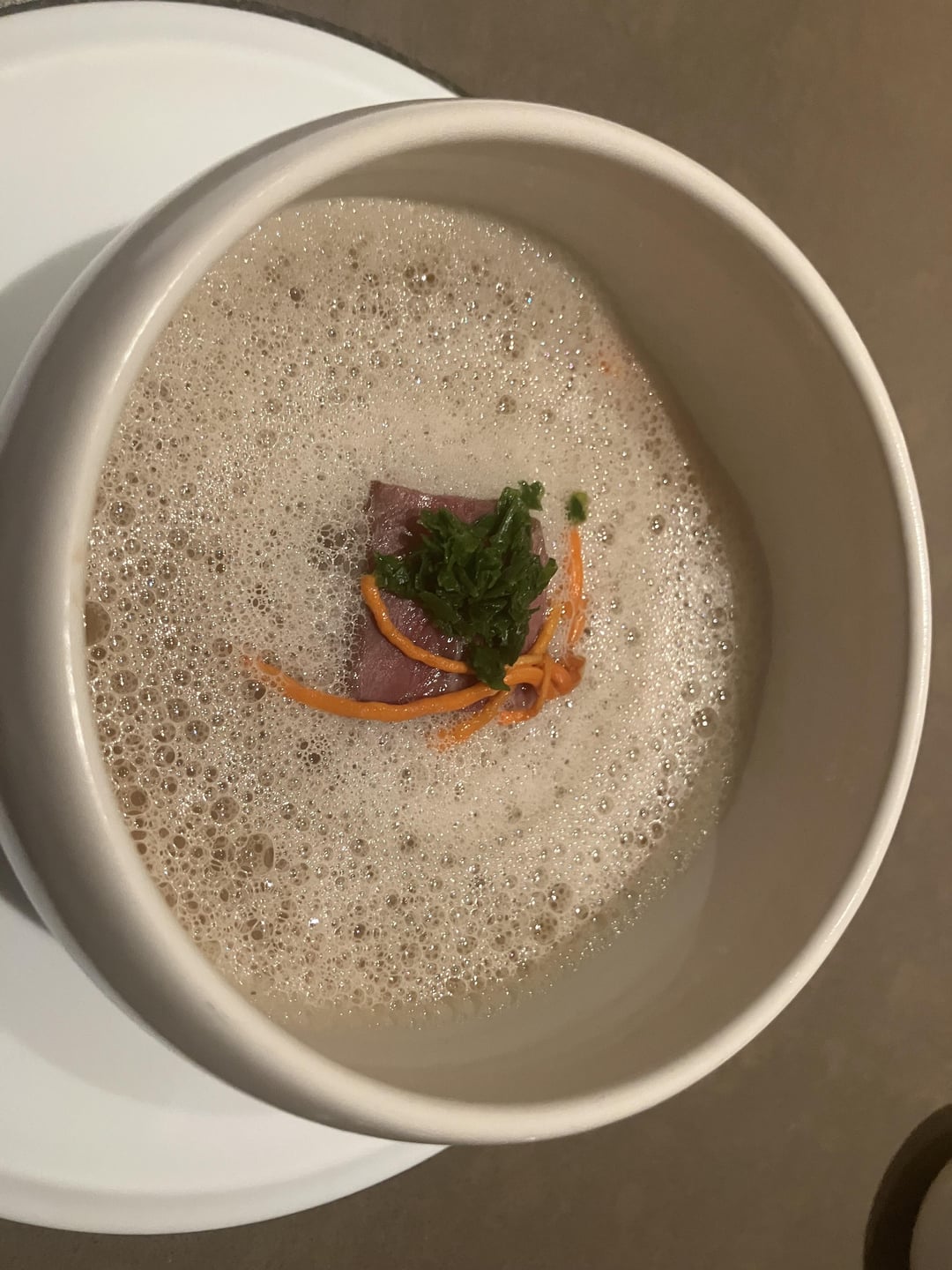 The soup course was possibly my favorite of the night: a chicken broth, with beef tripe and cheek and cordyceps. The broth was rich in collagen and flavor. Masterful textures in the tripe and cheek. A very heartwarming dish.