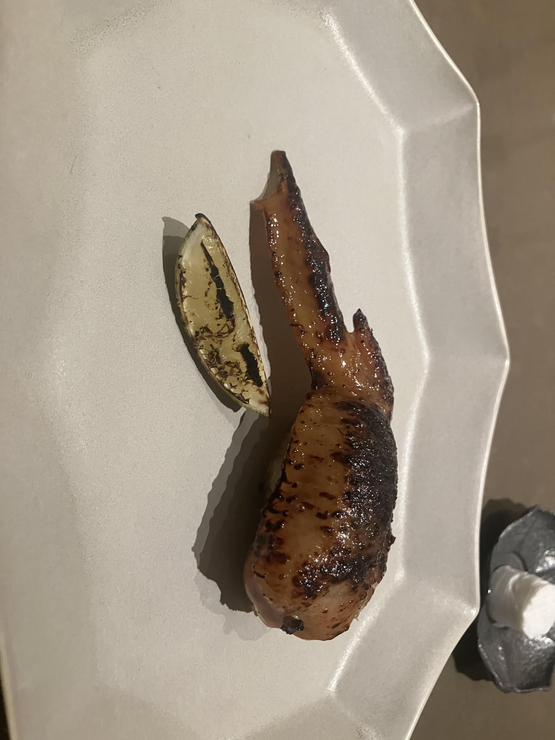 The stuffed chicken wing was an add on that was definitely worth the 22 SGD. Filled with blue pea flower infused rice, pork floss, and a fat prawn, this wing had the addictive sticky texture that Malay and Indonesian cuisine prizes in its poultry skins. While crispy skin is delightful in its own way, this sticky texture on a wing is my preferred way to eat chicken. The charred lime provided the needed acidity to liven everything up.