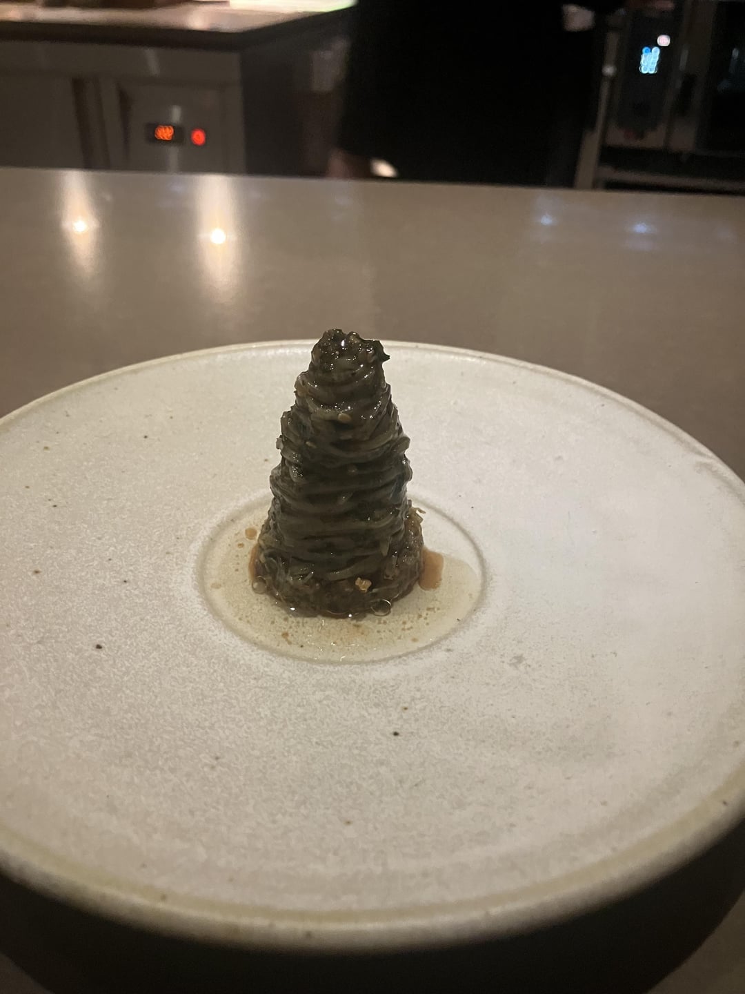 Finally, tuna in a tart shell was marinated in seaweed (and oyster sauce?) and covered in a ginger sphere. All fantastic, with many spices and deep flavors playing off each other.