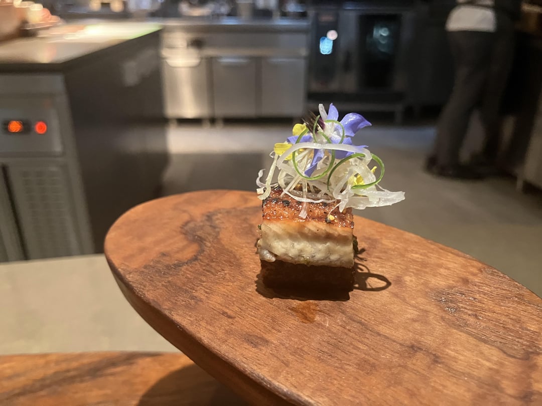 River eel was perfectly grilled and placed on top a seaweed toast.
