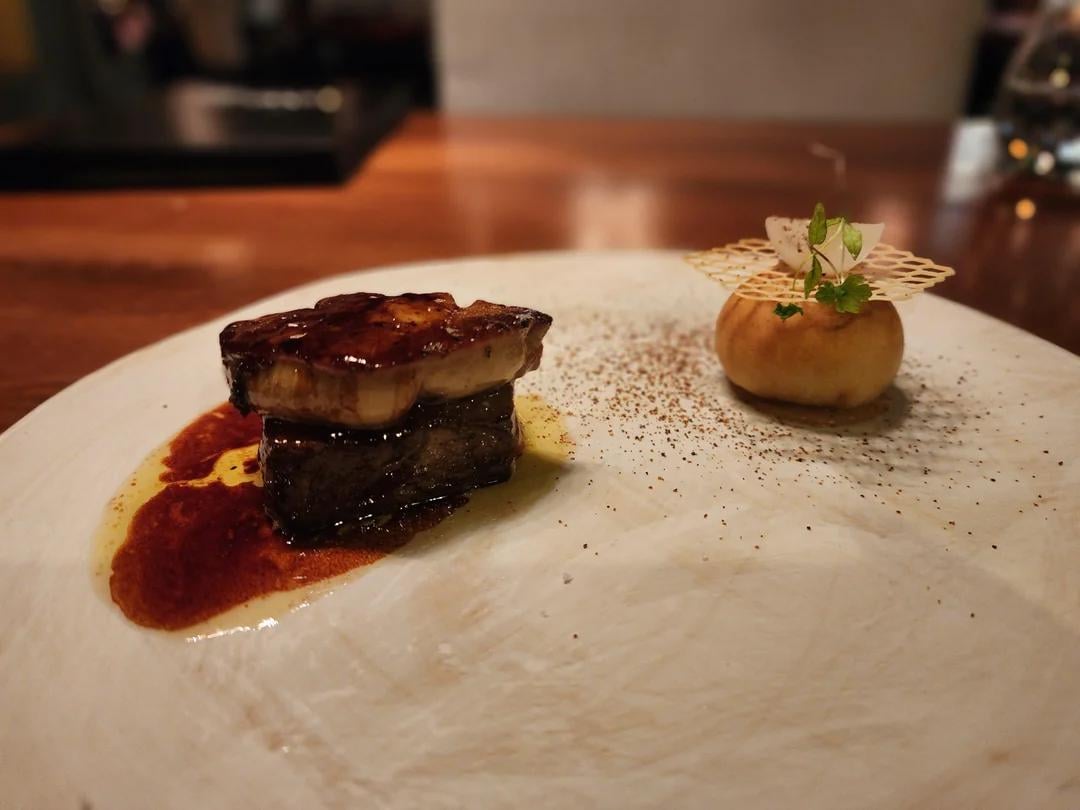 (12) Wagyu with Foie & potato mushroom puff – The other star of the night. Everything worked perfectly. Wagyu perfectly cooked and the added Foie took it over the top.