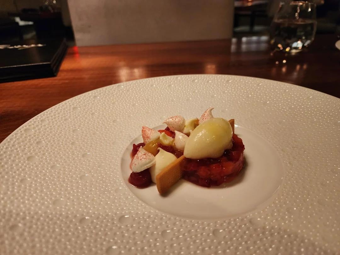 (14) Ice Cream Desert – Forgot what flavor the ice cream was (a little tired after the previous courses I forgot to put it in my notes) but it was good. The bits of meringue, strawberry and rhubarb were very nice.