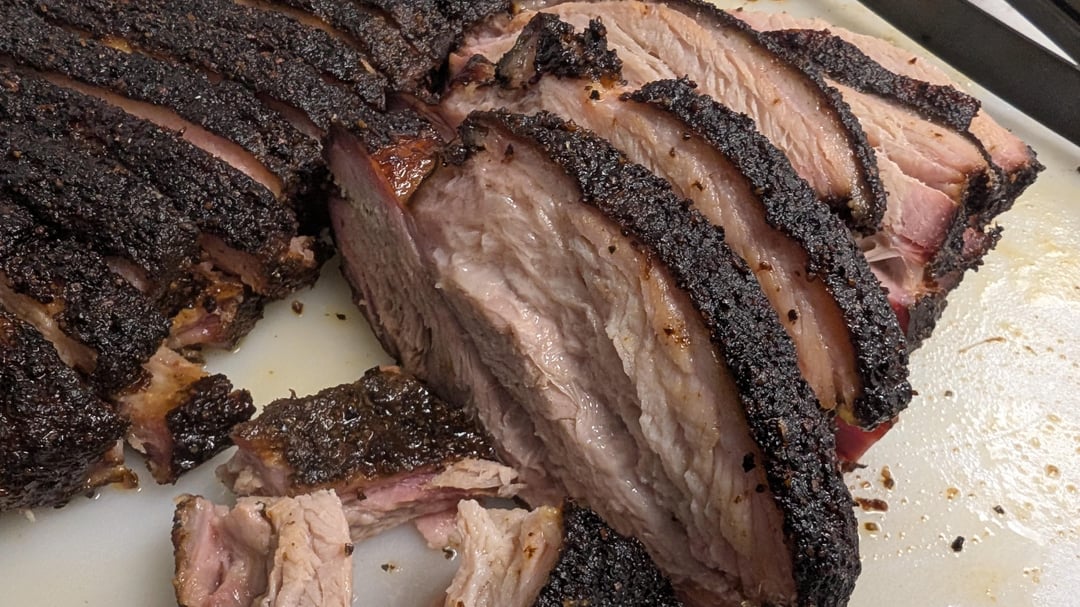 Cooked with Apple wood for 8 hours at about 240°-260° using 2×2 snake method. Spritzed once at halfway point with Apple Cider Vinegar.