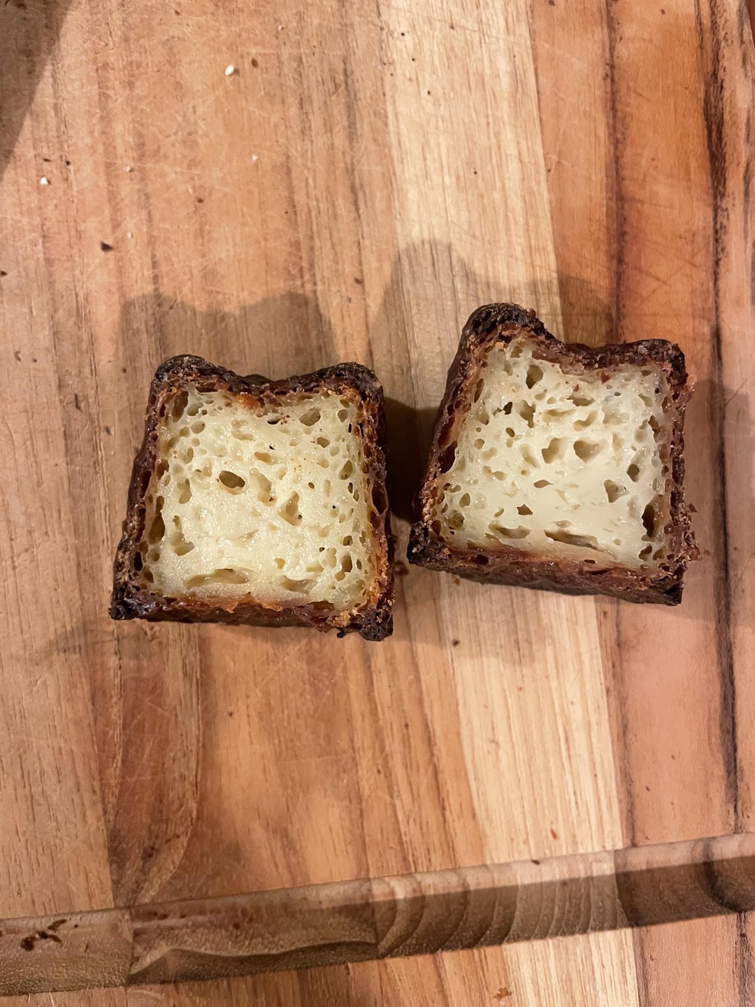 —First batch: 2 canelés, batter rested for 0 hours, baked for 13 min at 450, 375 for 2 min, then decided to do 400 for 38 minutes. They were slightly overdone on the outside (very dark), at least for my preference, and fairly custardy/a little underdone on the inside.