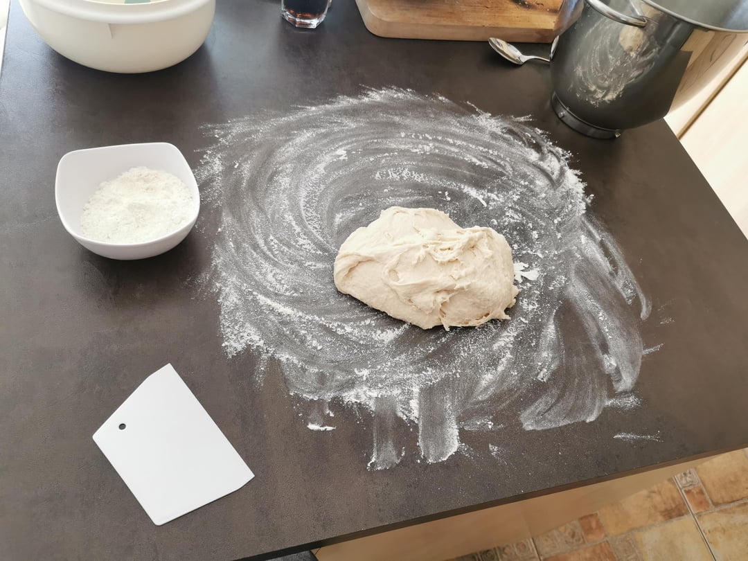 The flour gets the salt mixed in it. Then after the 10 minutes, you mix the milk with the water that has the yeast in it and then slowly add and mix the flour with the liquid. I have that mixing machine so I use that one on the second speed for 10 minutes to mix the dough well. You can do the whole mixing process with the machine tbf. After that, you knead it a bit and put it in a large bowl that you seal airtight and let it rest for 1,5 hours. Then you knead it again and let it rest for another 1,5 hours. The gently knead it, you measure it and decide how many rolls you wanna make. This dough ended up being 875 grs in the end so I made 8 out of them ~110 gr each.