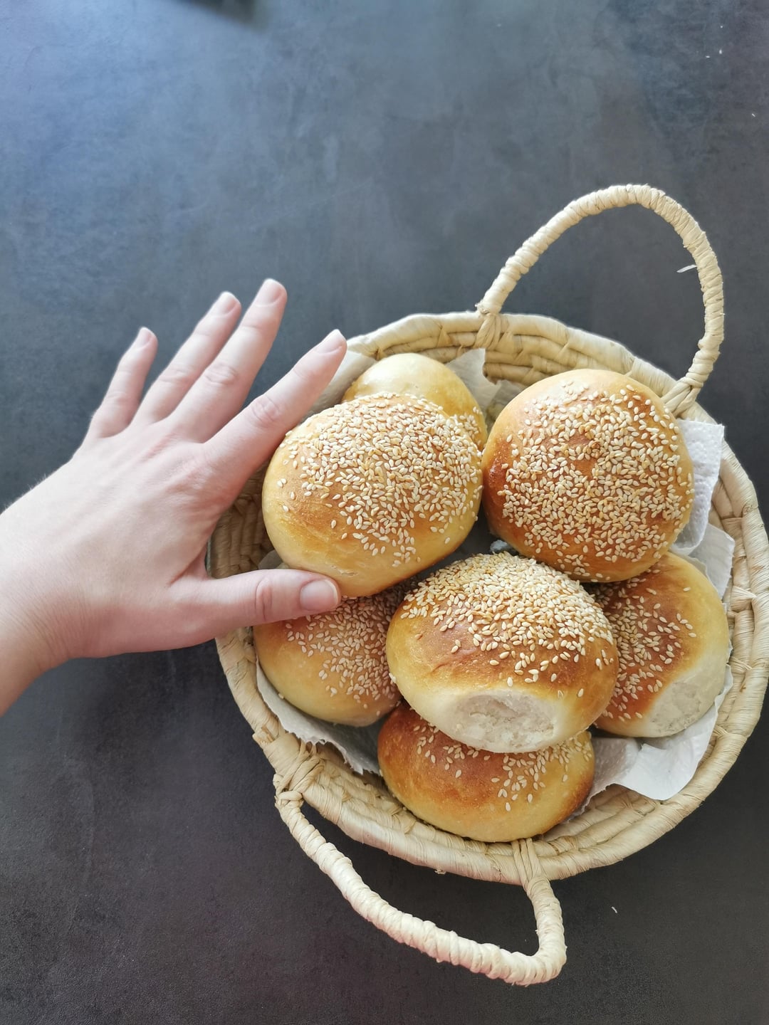 Recipe: flour (plain) – 500 gr water – 290 ml milk – 50 ml sugar – 1 tsp yeast – 7 gr salt – 2 tsp 1 egg white for making them look shiny sesame seeds